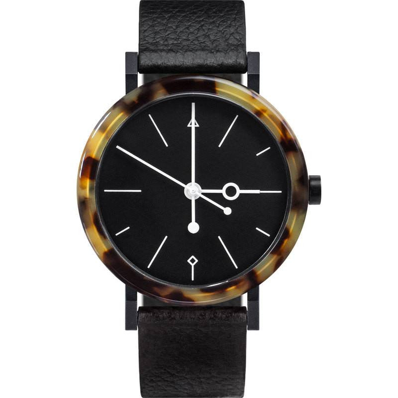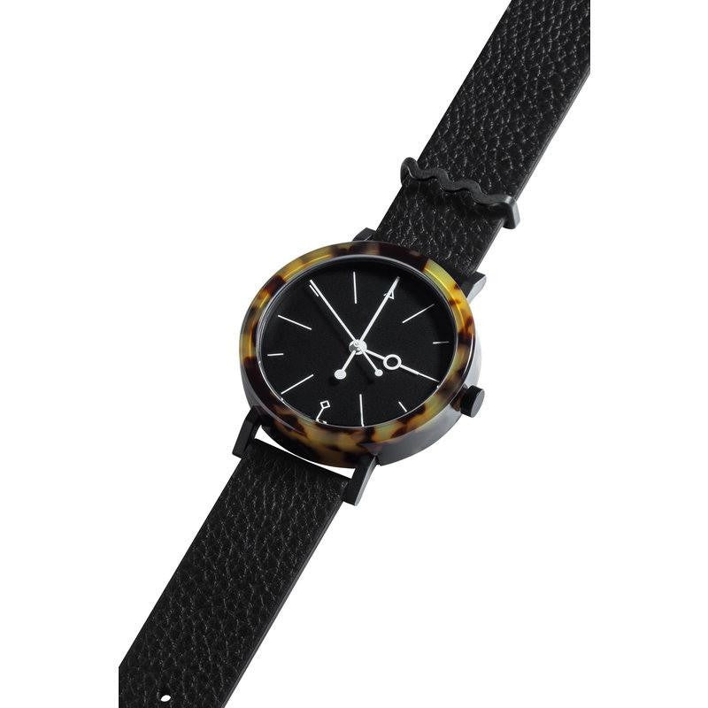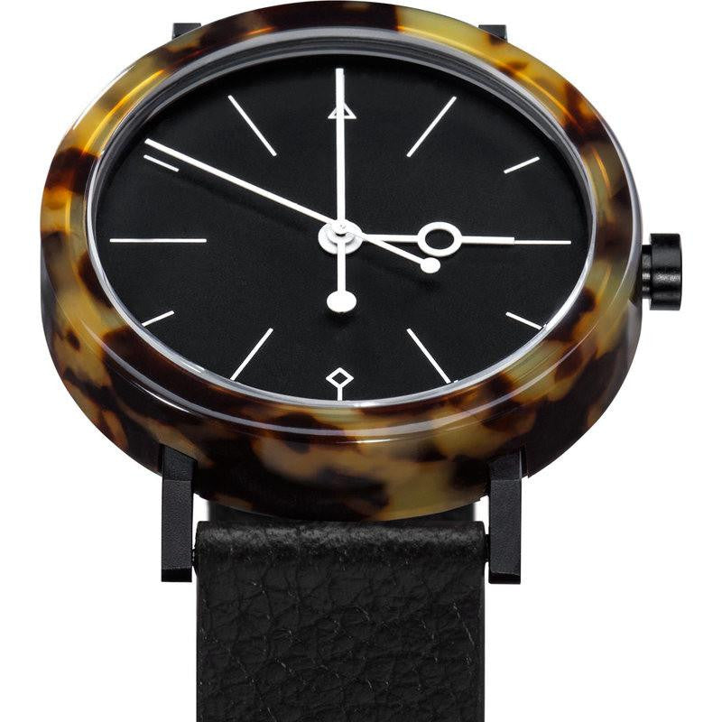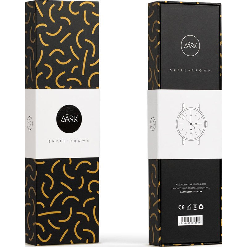 AÃRK’s signature minimalism shines through in The Brown Shell Watch, a homage to classic watch design. With unique pattering of each hand-molded acetate case, no two Shell Watches are the same. Traditional design is referenced in the elongated indexes and Italian calfskin leather band, while geometric details and a wave-form steel keeper carry the graphic signature of AÃRK’s 002 collection. Driven by reliable Japanese Quartz movement, you'll never find yourself chasing time.