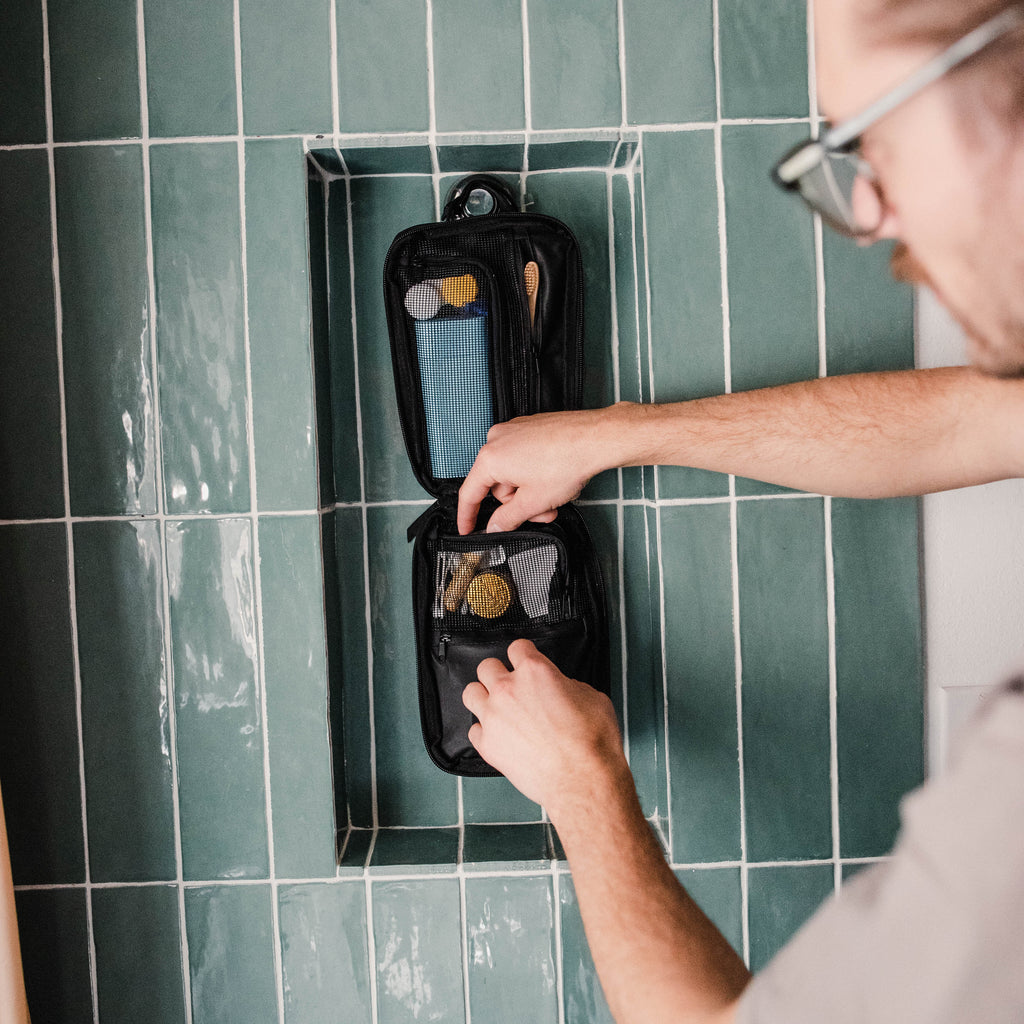 Perfect for packing a ton of toiletries while staying compact. Six pockets to keep your stuff organized & sanitary...i.e. keeping your toenail clippers off your toothbrush. Great for travel-sized toiletries to pack light & minimally.