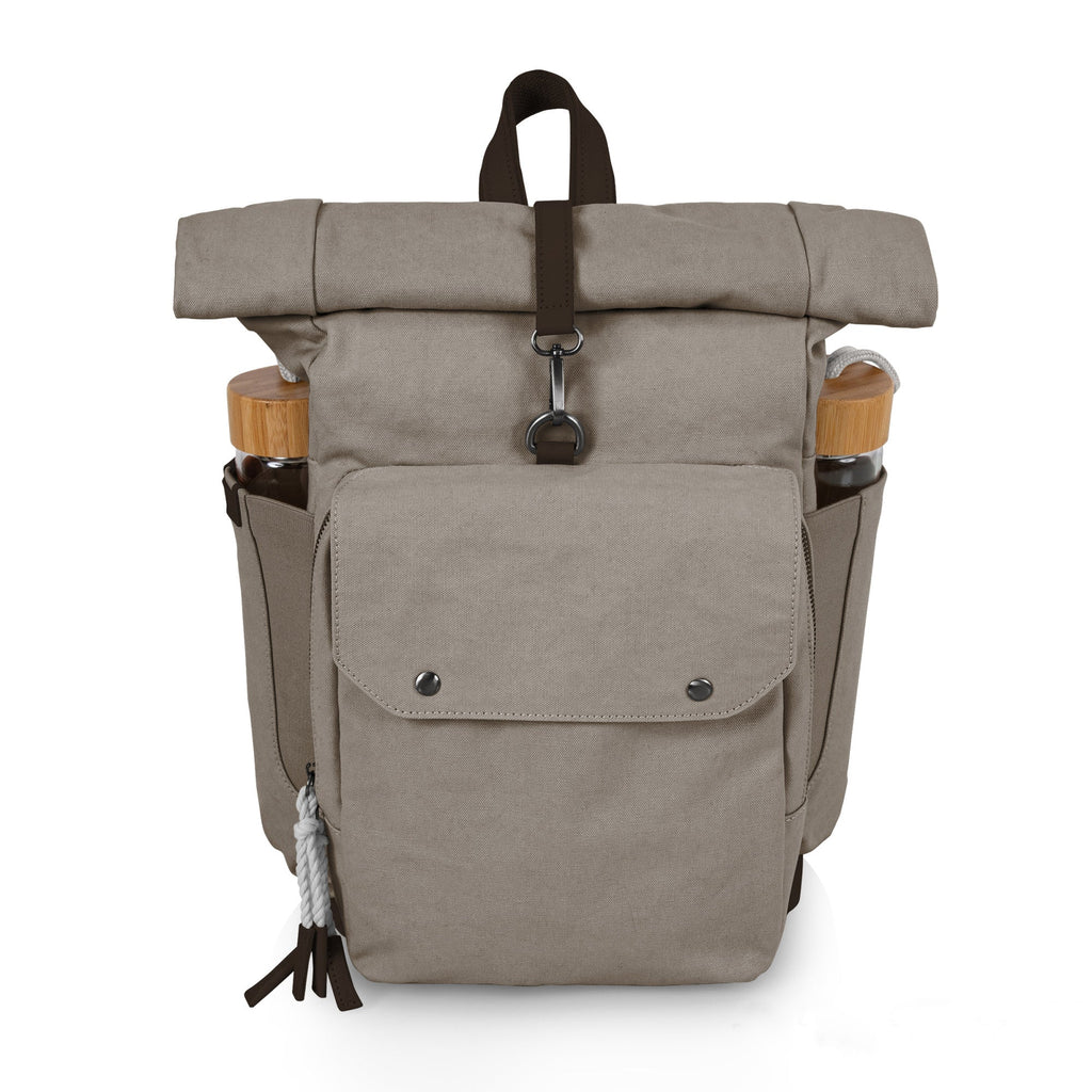 The Carmel Roll Top Picnic Backpack Cooler with components brings together a certified recycled cotton canvas exterior with a waterproof, insulated, eco-friendly interior to create one stylish and functional package. But wait - that’s not all! The component pocket in this soft cooler bag can easily store all the included picnic accessories: two sets of stainless steel utensils, two recycled plant fiber plates and two glass water bottles. The roll top provides even more space for snacks and drinks, and the durable bottom helps keep everything in this outdoor cooler dry. Truly an outdoor concert and travel essential, the front slip pocket with key loop, magnetic top closure, and security pocket on the back keep your valuables safe yet accessible in a crowd. Classic good looks AND highly functional design? If it was your date, it would be too good to be true - but luckily, it’s a backpack cooler.