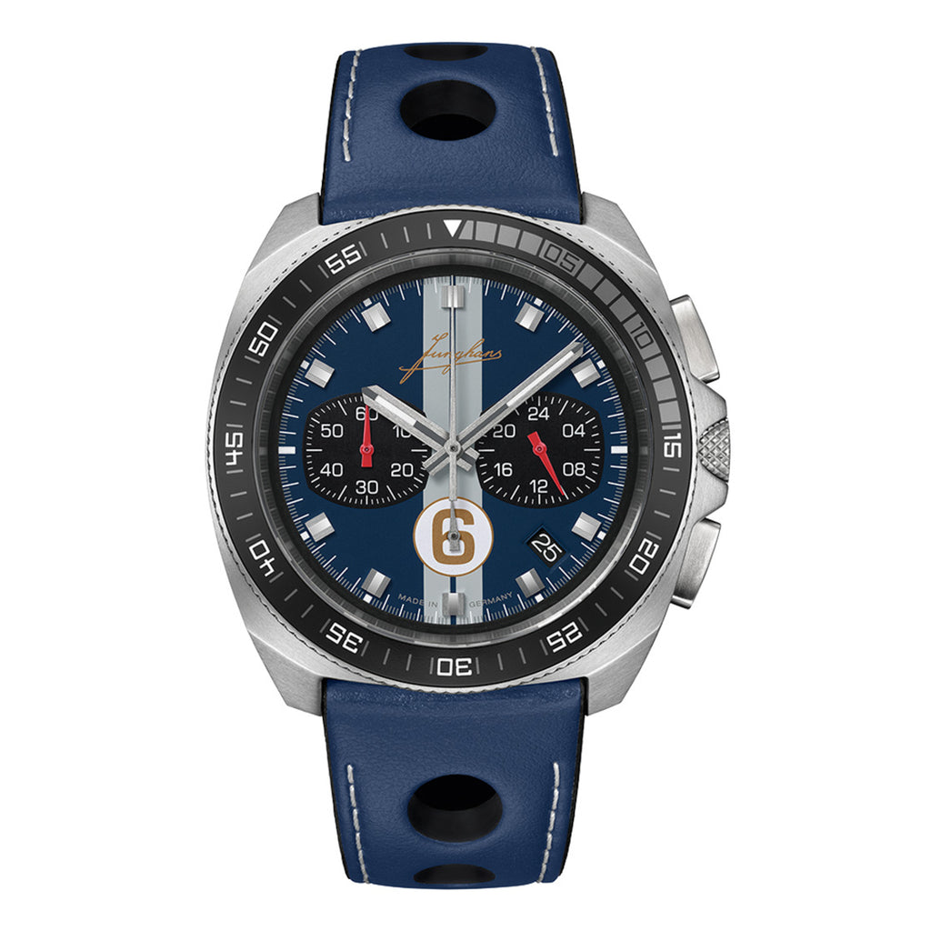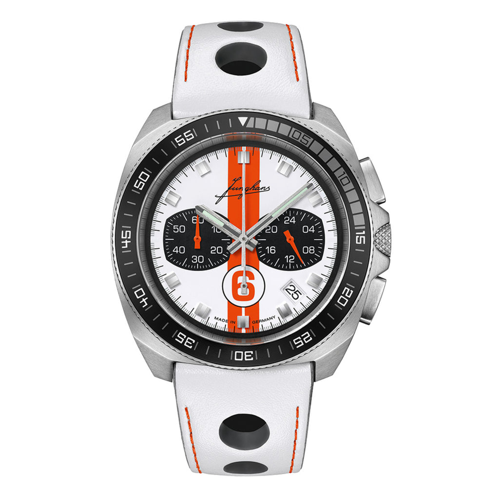 The love of sport in general and sports timekeeping in particular have a long tradition at Junghans. This began in the 1920s with the first hand stopwatches and continued with the timekeeping of numerous sports competitions culminating in Munich in 1972. The limited 1972 Chronoscope Sports Edition 2025 features a striking double stripe, the historical Junghans lettering and the number 6 in the form of a starting number.The watch is limited to 200 collectors' items.