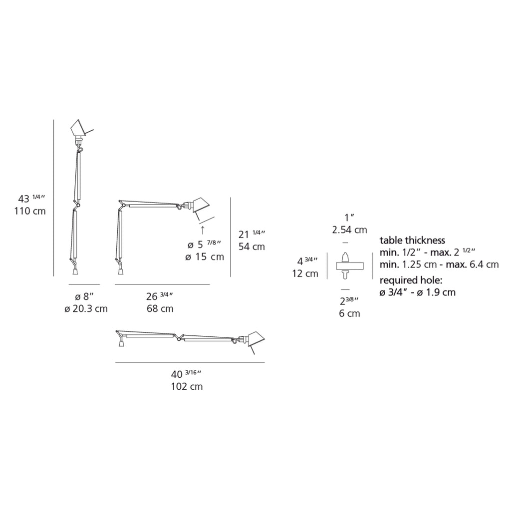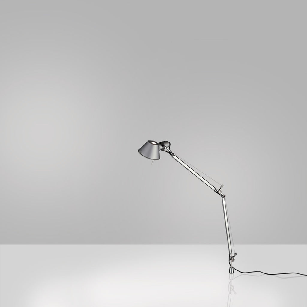 A study in balance and movement, the Tolomeo table lamp is designed for a fully adjustable direction of light. Created for Artemide in 1987 by Michele De Lucchi and Giancarlo Fassina, Tolomeo has become an icon almost 30 years after its birth. Now available with integrated LED light source, model variations include an incorporated dimmer switch on the head, a motion sensor which uses passive infrared technology for energy conservation, and/or Tunable White LED technology allowing for varied intensities and color temperatures to be obtained.