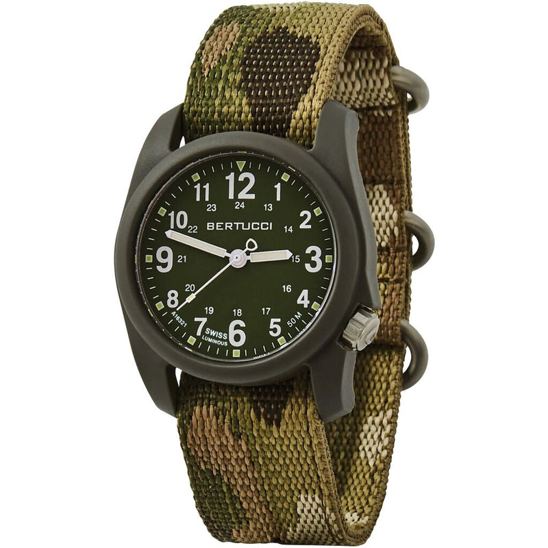 Elevate your adventurous spirit with the Bertucci DX3 CAMO Watch. Its classic design meets rugged performance, featuring a 40mm matte dark olive polycarbonate case reinforced by a U.S. Patented Unibody™ fiber structure. The scratch-resistant R-Type mineral crystal preserves the olive dial, while Swiss super luminous hands & markers ensure easy readability day or night. With a reliable Japanese movement & 4-year battery life, precision is at your wrist. Dive in with 50m water resistance & embrace style with the #64MC Multicam C-Type Camo Webbing band. Engineered for comfort, this watch accompanies you through every endeavor.