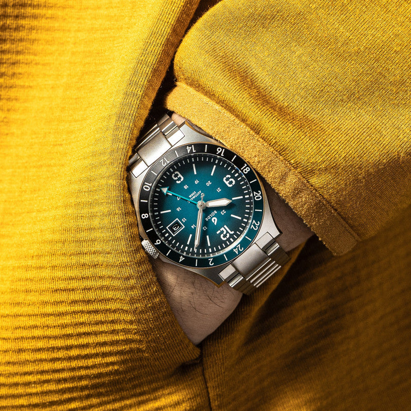 Introducing the Safari GMT Banff, a timepiece inspired by the breathtaking beauty of Canada's Banff National Park. Reflecting the park's vibrant hues, this SII NH34-powered watch features a captivating contrast GMT hand reminiscent of Banff's turquoise lakes against lush green landscapes. With its precision-engineered functionality, including a prominent date display at 3 o'clock, this watch embodies the spirit of exploration and adventure found in Banff's majestic wilderness. The Safari is a compact beast forged with tough stainless steel and a determination for exploration. Measuring 40mm across your wrist, this GMT edition has a fixed dual-tone bezel graduated for 24 hours, handy for tracking two time zones simultaneously.