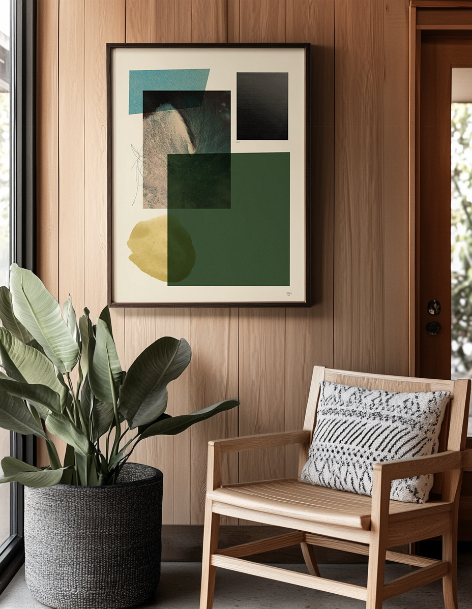 Immerse your space in earthy elegance with this abstract green and ochre art print. Ideal for modern, minimalist, nordic or Japandi-inspired interiors.