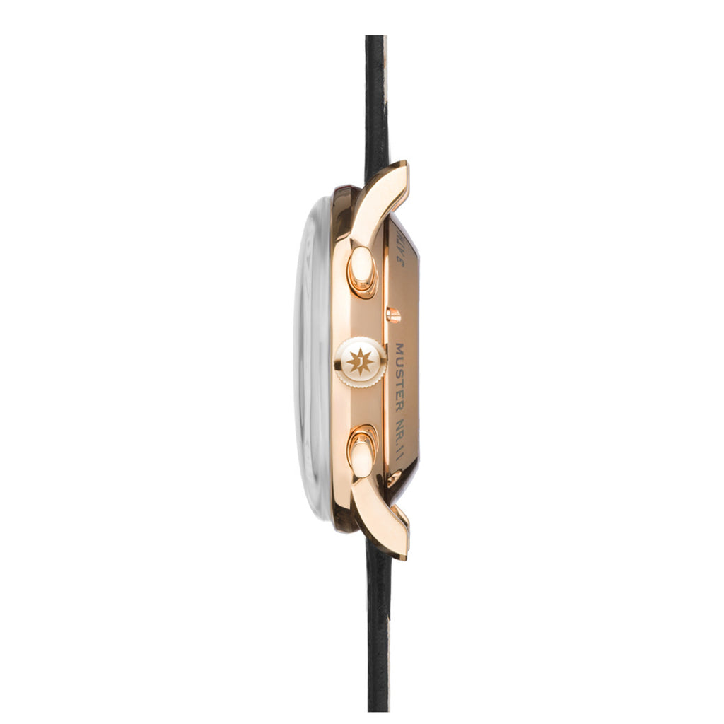 Elegant or dynamic? A moot consideration for the Meister Chronoscope. After all, this watch effortlessly combines classic charm with sporty functions. The characteristic, bowl-like dimples for the auxiliary dial are a typical feature for the Meister range.