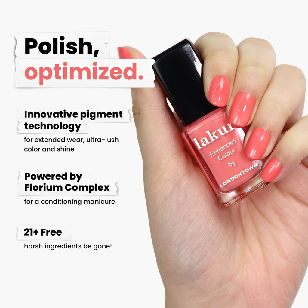 Start with any kur® base coat. Once the first layer has dried, apply 1-2 coats of lakur as needed. Let the polish dry for 10-15 seconds and seal with any kur® top coat. To expedite the drying process, apply 1-2 drops of Accelerating Drying Oil at the cuticle and allow the oil to run to the free edge of the nail.