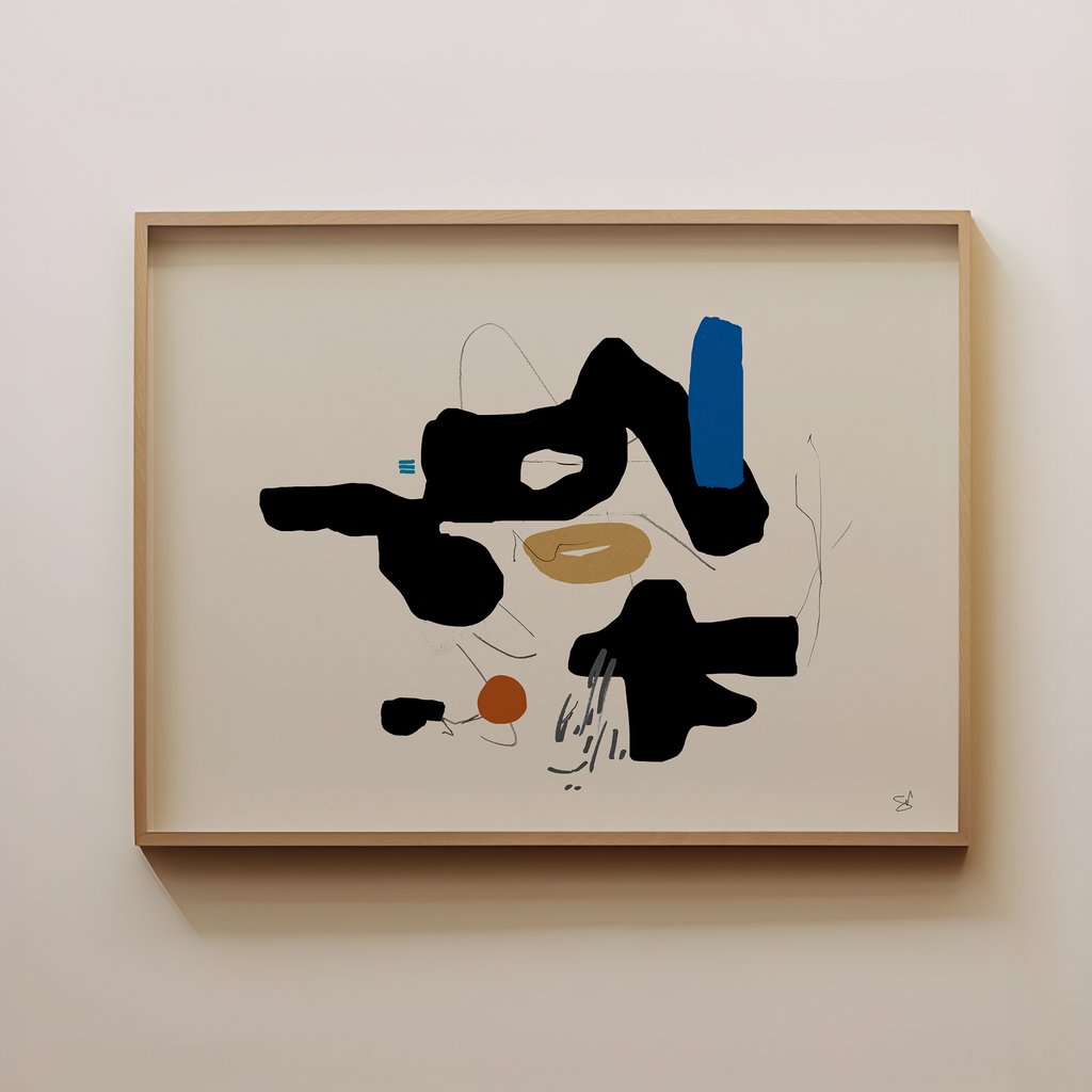 Museum-Quality Matte Paper Poster. A playful blend of abstract black forms and colorful brushwork. This print adds dynamic movement and modern charm to any wall. Ideal for modern or Japandi interiors or wabi-sabi
