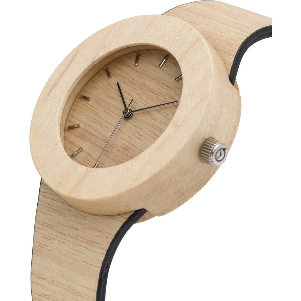 The Analog Carpenter Watch was designed to be sleek and subtle in form. The Silverheart & Maple Watch will truly unify you with nature featuring minimal branding and all natural materials, like you carved it yourself. The delicate watch hands glide along a truly one-of-a kind natural watch face with subtle hour markings. The flexible Silverheart strap made from lumber offcuts and a solid Maple body giving this timepiece a beautiful and earth friendly appeal. The Analog Silverheart & Maple is a sophisticated, eco-conscious timepiece that is over 80% biodegradable.