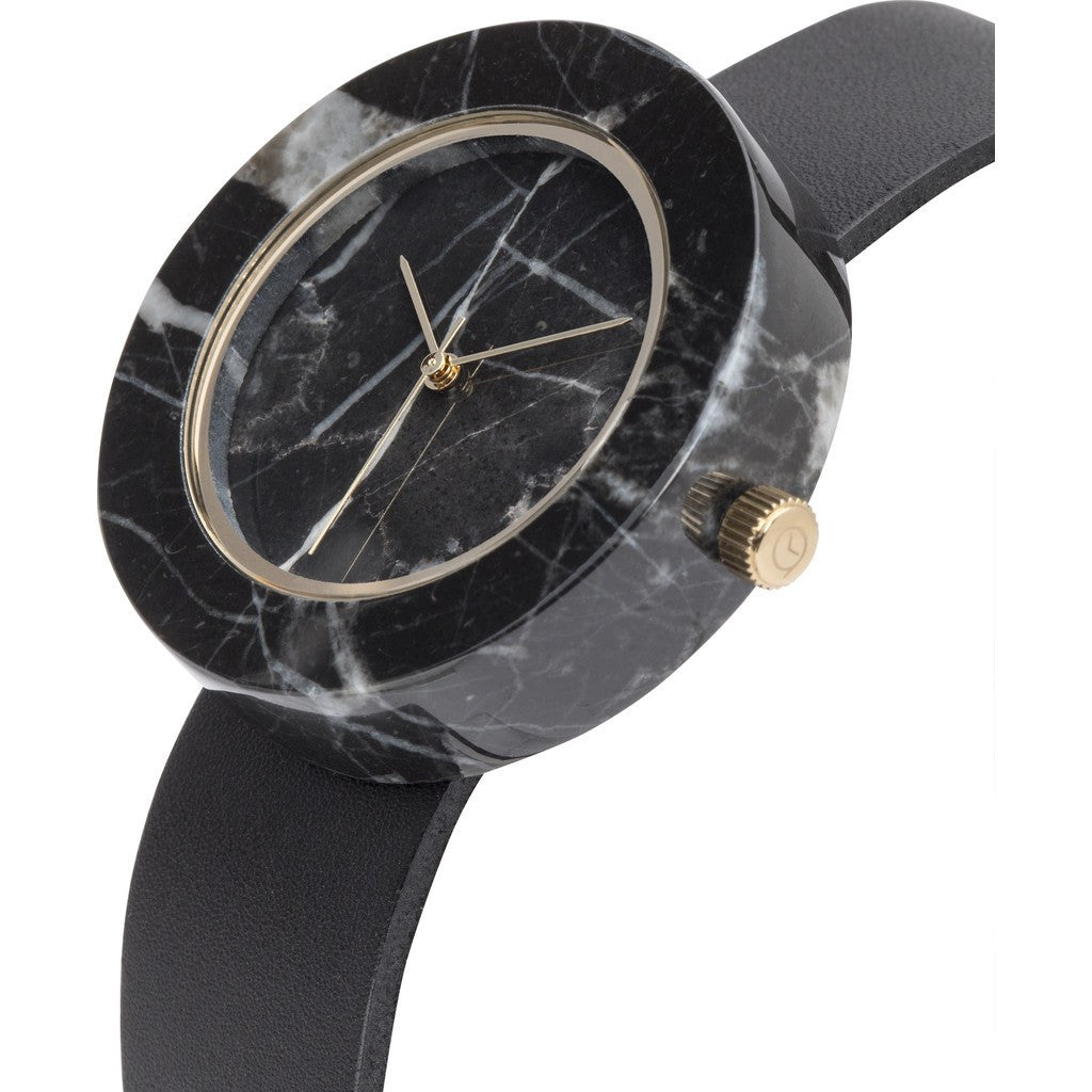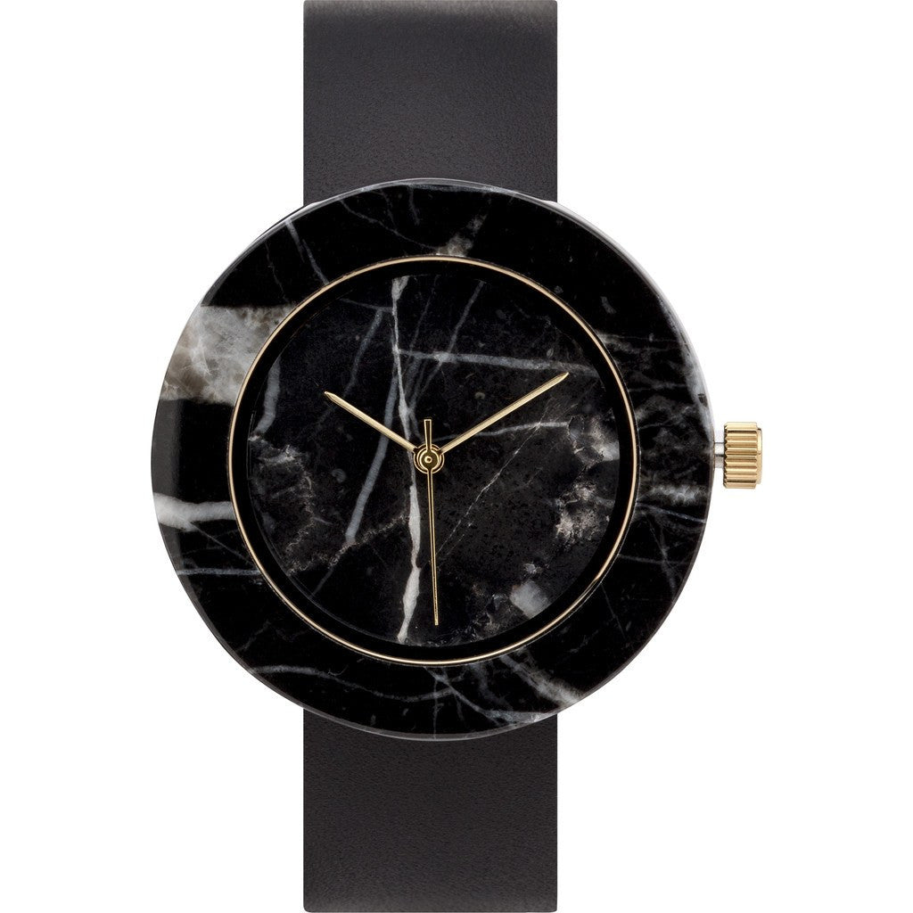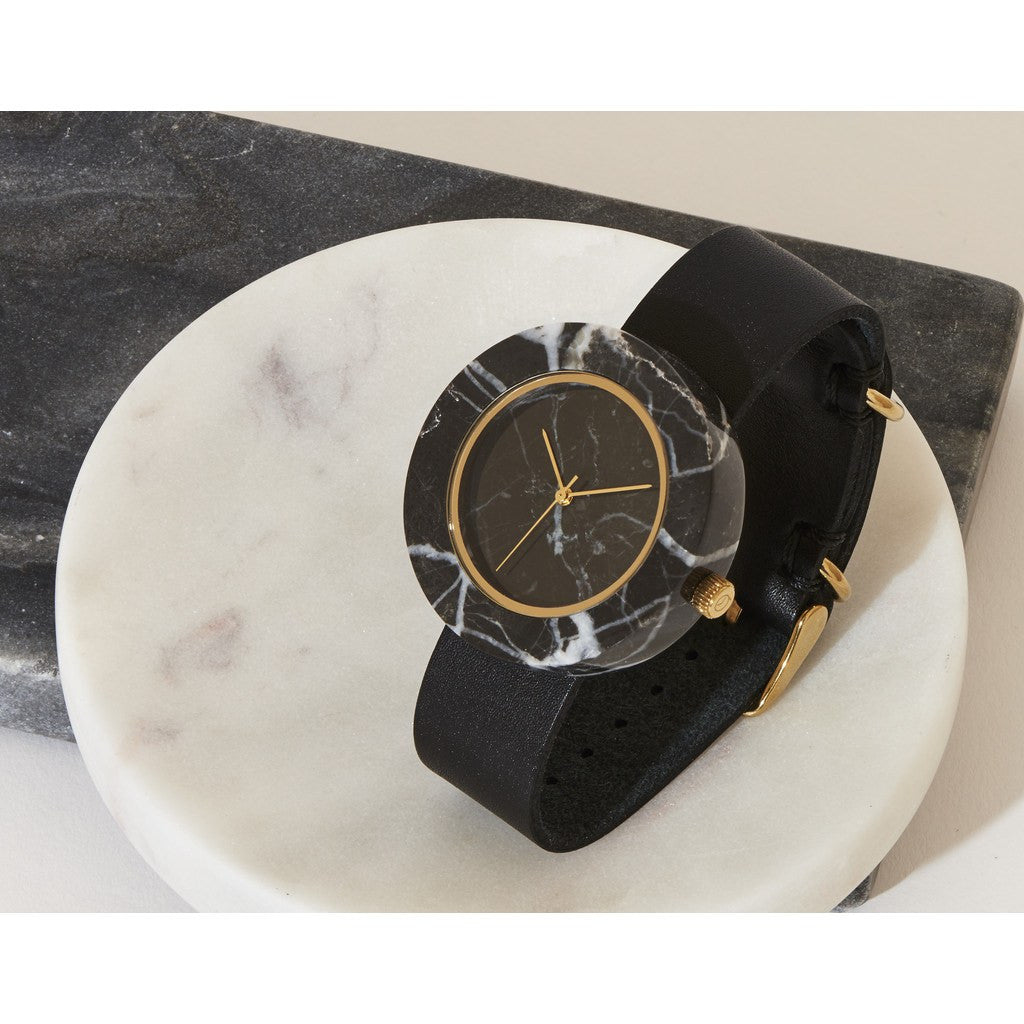 Analog's Mason Collection is designed to be distinct yet minimal. Made with genuine marble, the Black Marble Circular Watch closely resembles a piece of art with the gold finishing and black leather strap. The Mason Collection truly showcases the beauty of all natural marble with the unmarked dials.
