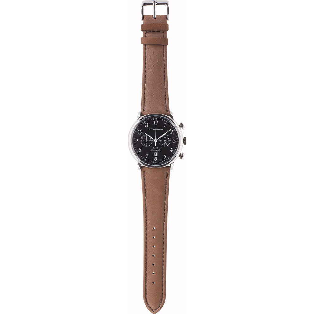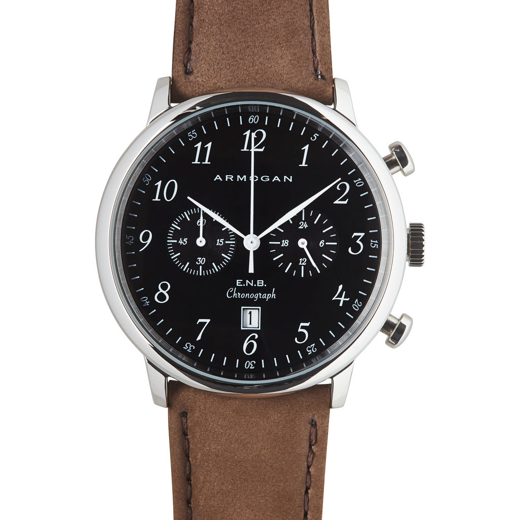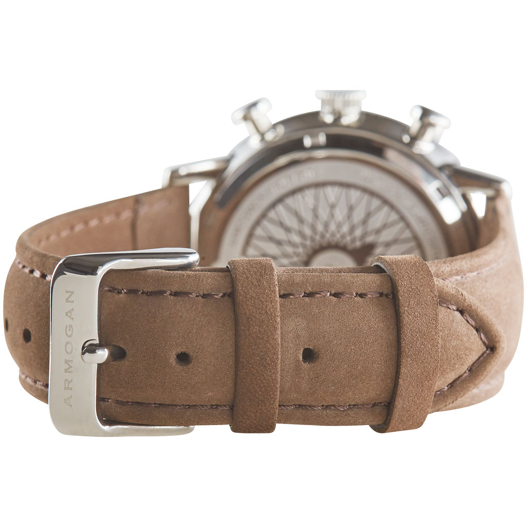 Be bold, adventurous, and confident in Armogan's E.N.B C31 Chronograph Watch in Silver/Black dial and Brown suede leather strap. Inspired by the legendary race cars of the 20th century, this gorgeous 42mm stainless steel case with slightly curved glass and a suede leather racing strap gives the watch the sleekness, elegance, and power that will recall those roaring engines and impossible speeds. The contrast between the stitching and leather gives the watch a unique, striking edge that mimics the interior of a fine automobile. This theme is rounded out with the engraved spinning wheel on the back. Features include a stopwatch and a 24-hour indicator so you have the easiest access to the tools and information you need. The richness of tradition and nostalgia is brought to elegant and fluid life.
