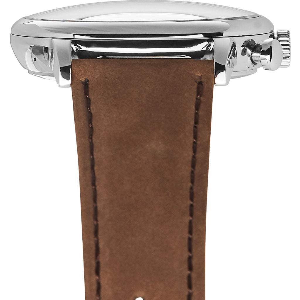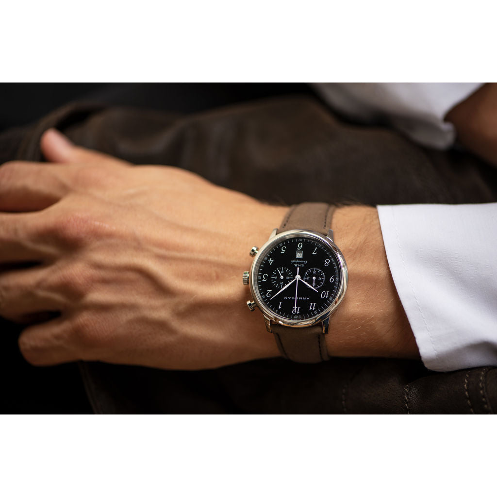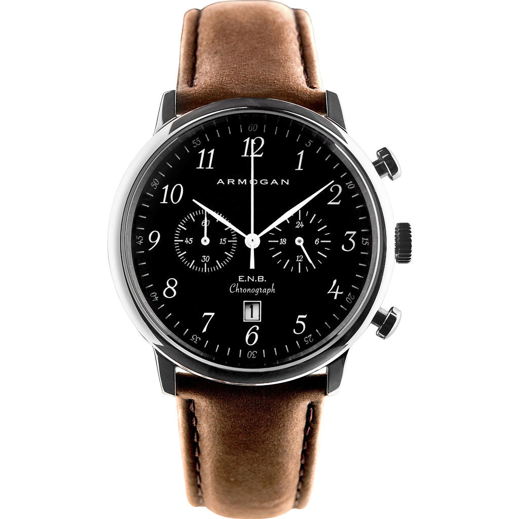 Be bold, adventurous, and confident in Armogan's E.N.B C31 Chronograph Watch in Silver/Black dial and Brown suede leather strap. Inspired by the legendary race cars of the 20th century, this gorgeous 42mm stainless steel case with slightly curved glass and a suede leather racing strap gives the watch the sleekness, elegance, and power that will recall those roaring engines and impossible speeds. The contrast between the stitching and leather gives the watch a unique, striking edge that mimics the interior of a fine automobile. This theme is rounded out with the engraved spinning wheel on the back. Features include a stopwatch and a 24-hour indicator so you have the easiest access to the tools and information you need. The richness of tradition and nostalgia is brought to elegant and fluid life.