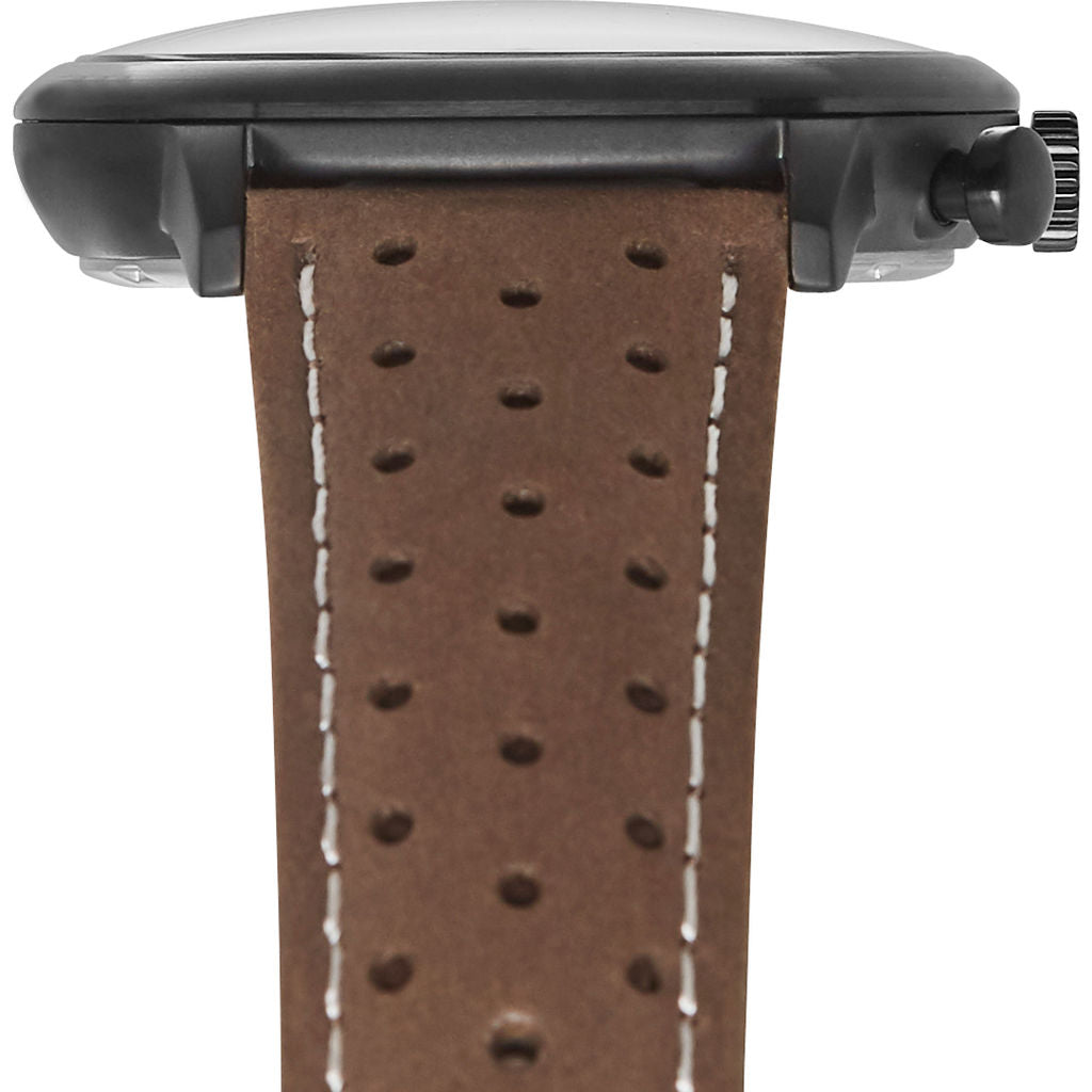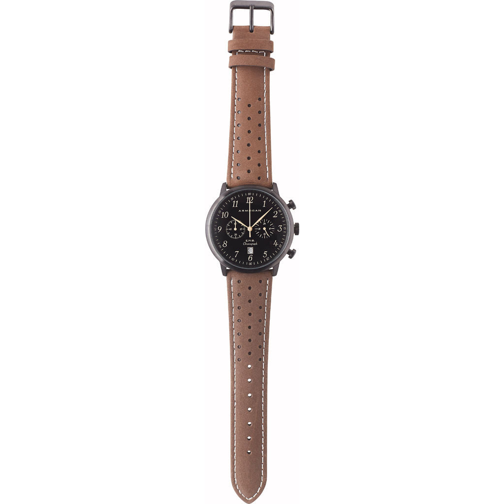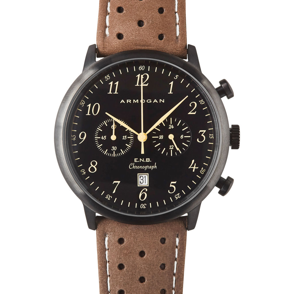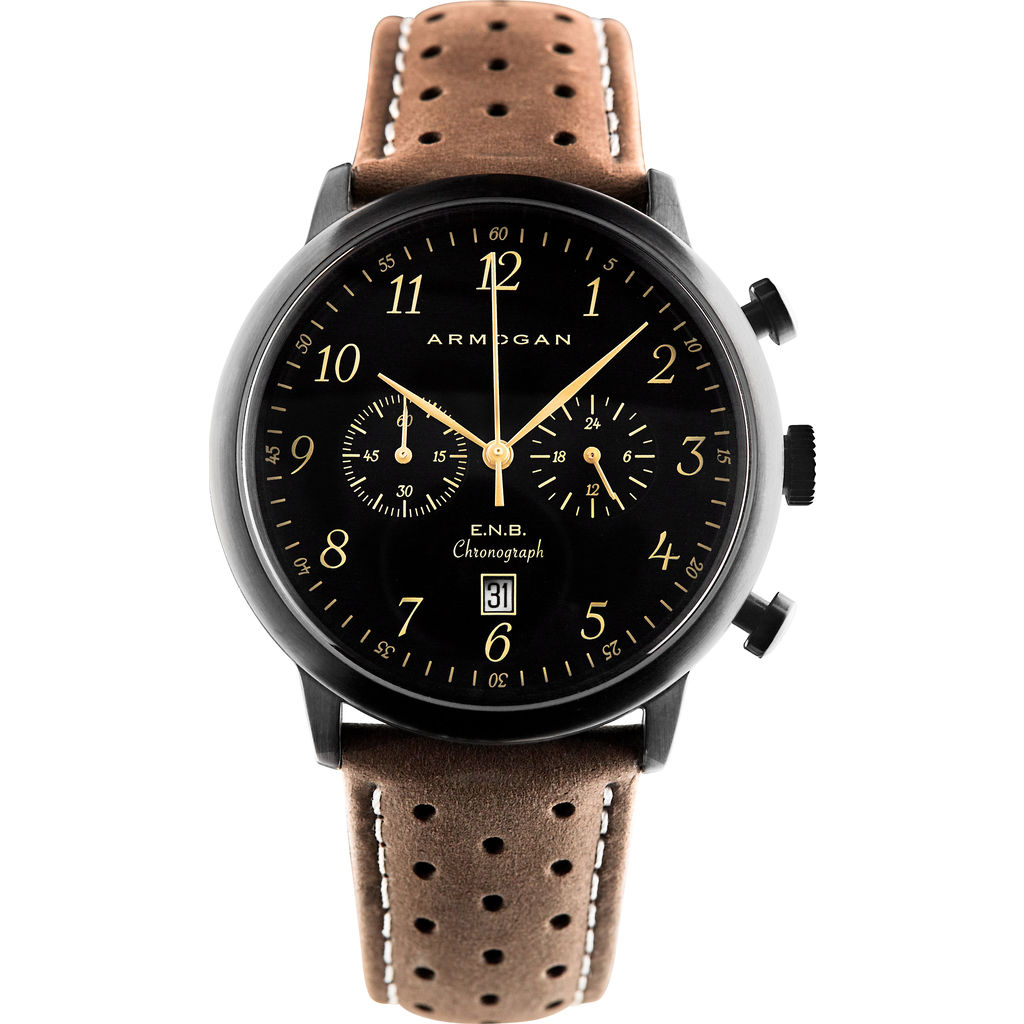 Be bold, adventurous, and confident in Armogan's E.N.B C61 Chronograph Watch in Chocolate Brown dial and Brown suede leather strap. Inspired by the legendary race cars of the 20th century, this gorgeous 42mm stainless steel case with slightly curved glass and a suede leather racing strap gives the watch the sleekness, elegance, and power that will recall those roaring engines and impossible speeds. The contrast between the stitching and leather gives the watch a unique, striking edge that mimics the interior of a fine automobile. This theme is rounded out with the engraved spinning wheel on the back. Features include a stopwatch and a 24-hour indicator so you have the easiest access to the tools and information you need. The richness of tradition and nostalgia is brought to elegant and fluid life.