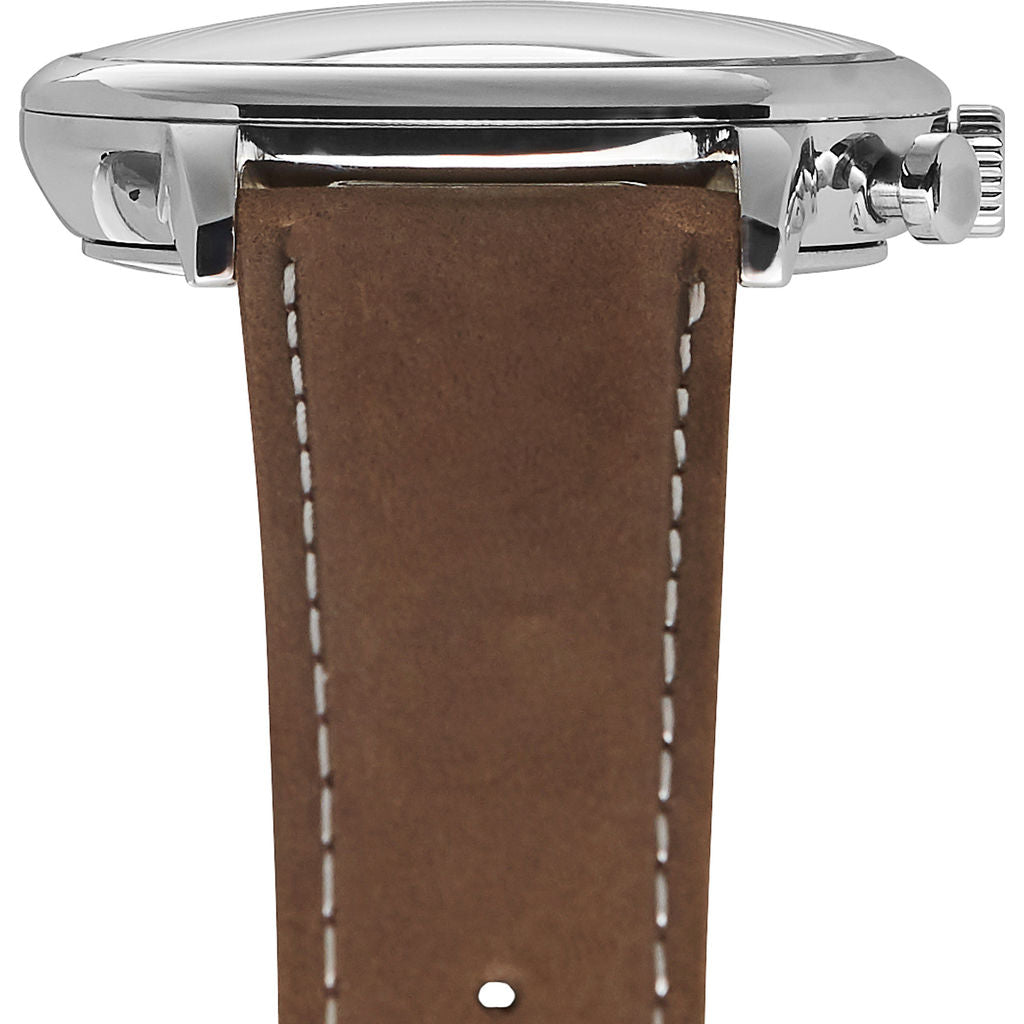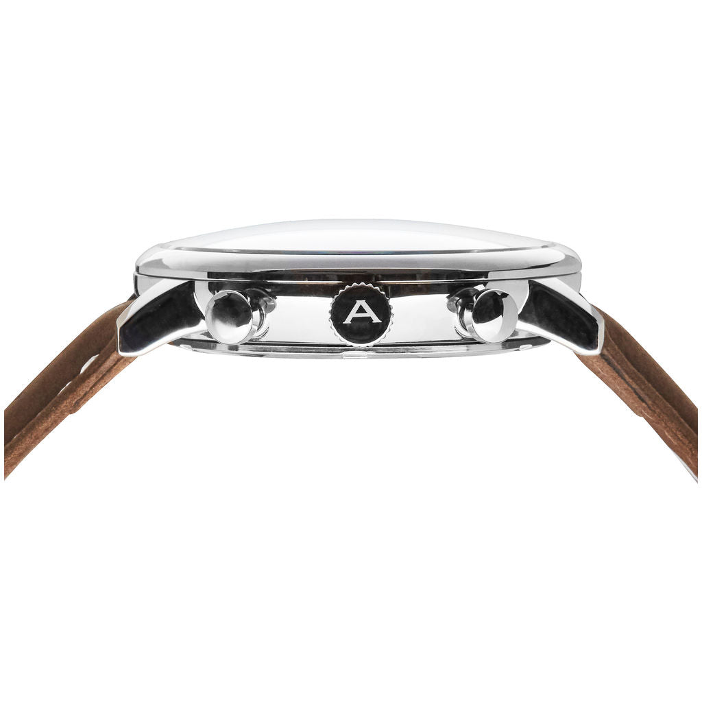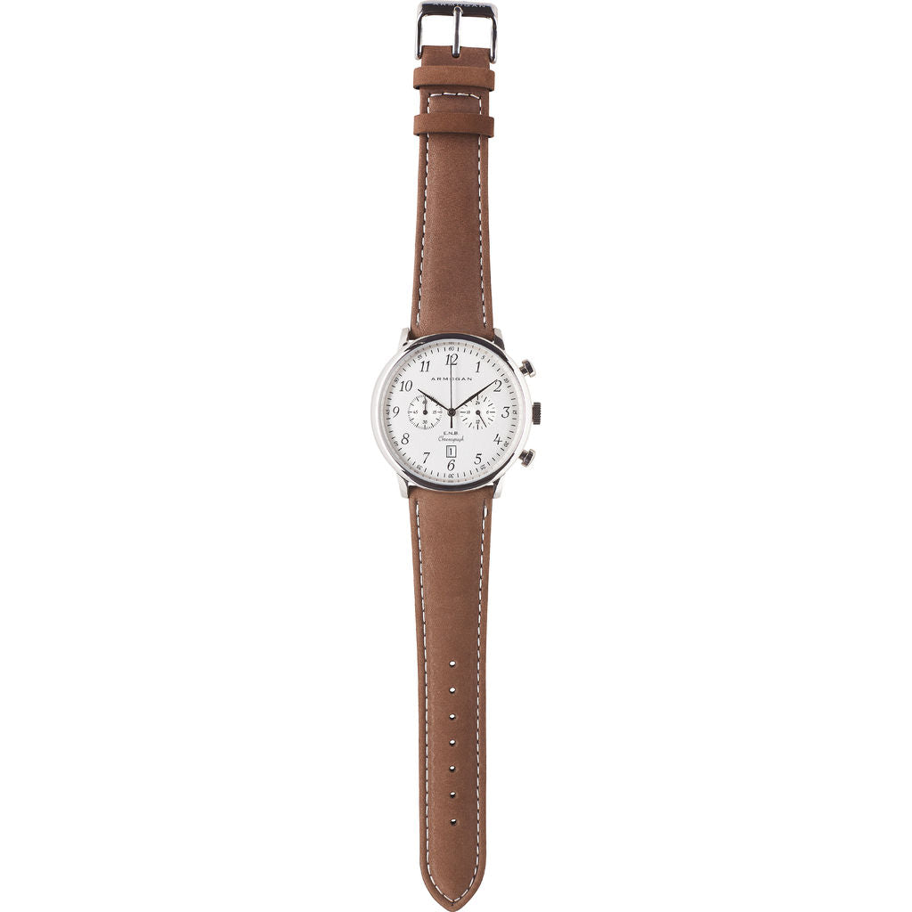 Be bold, adventurous, and confident in Armogan's E.N.B C81 Chronograph Watch in Silvered White dial and Brown suede leather strap. Inspired by the legendary race cars of the 20th century, this gorgeous 42mm stainless steel case with slightly curved glass and a suede leather racing strap gives the watch the sleekness, elegance, and power that will recall those roaring engines and impossible speeds. The contrast between the stitching and leather gives the watch a unique, striking edge that mimics the interior of a fine automobile. This theme is rounded out with the engraved spinning wheel on the back. Features include a stopwatch and a 24-hour indicator so you have the easiest access to the tools and information you need. The richness of tradition and nostalgia is brought to elegant and fluid life.