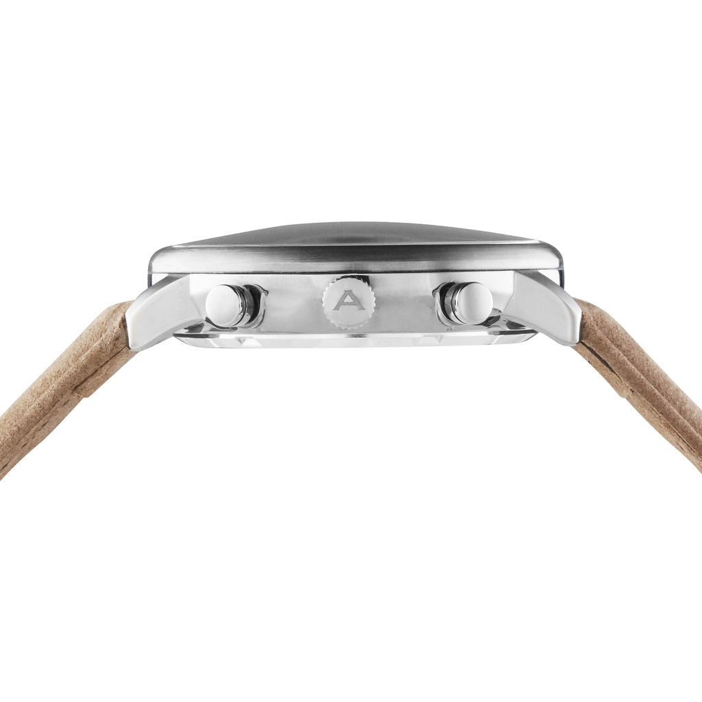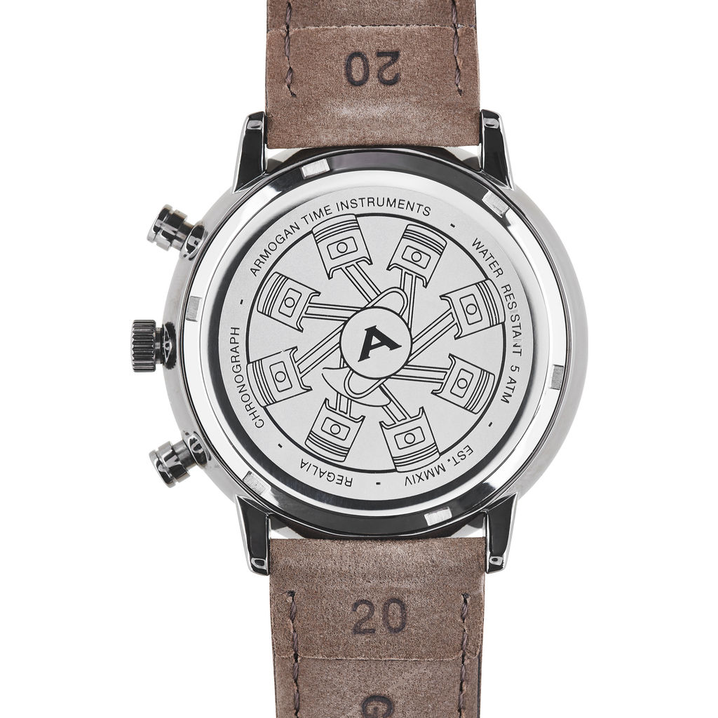 The Blue Sapphire Regalia S-44 Chronograph Watch was inspired by the British café racers of the 1950’s. This time piece pays homage to their love of speed, motorcycles and rock ‘n’ roll. The leather bands evoking the leather jackets, and the details of metal pistons and street bikes. Armogan created the Regalia collection to celebrate the fearlessness of members of the legendary ‘Ton Up Club’ and the ’59 Club’ who were able to reach the elusive ‘ton’ – 100 miles per hour. This stylish watch features Miyota OS11 Chronograph movement, domed mineral crystal, and a 4Omm wide stainless steel case. Featuring a distinctive concave face design and vintage color variations. This watch is the perfect badge of honor for anyone with a need for speed and adventure.