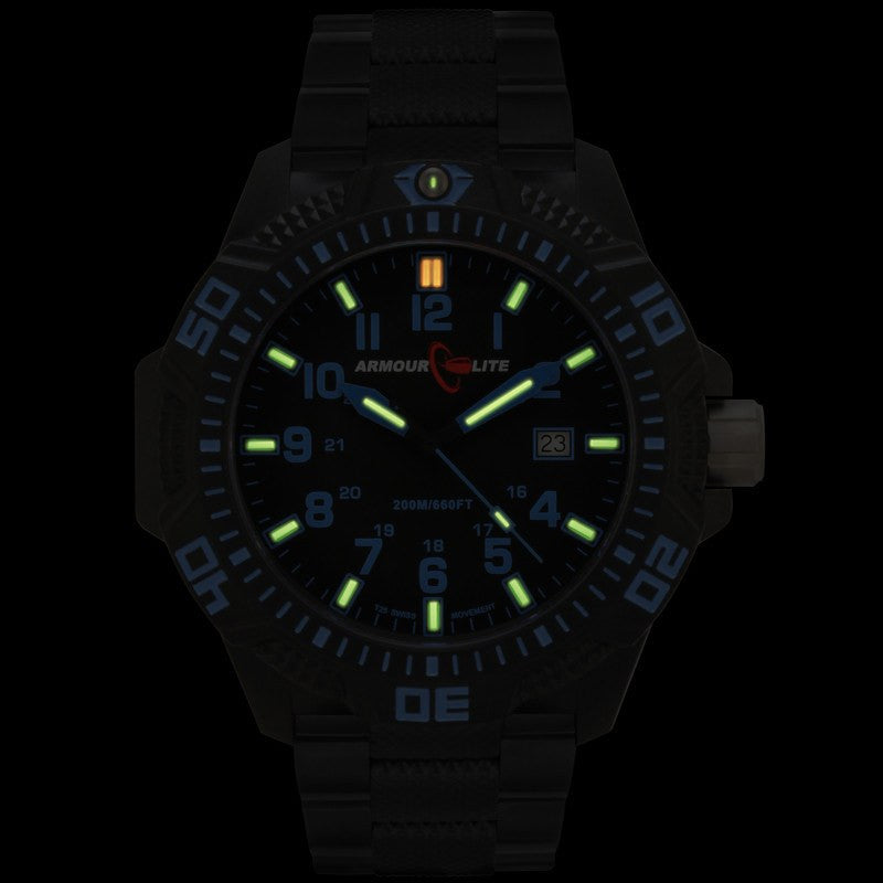 The Armourlite Caliber series features a lightweight polycarbonate case construction coupled with a durable sapphire crystal. A PVD coated (physical vapor desposition) stainless steel band holds that securely on your wrist while adding durability, class, and the solid weight you want to feel from a high-caliber timepiece.