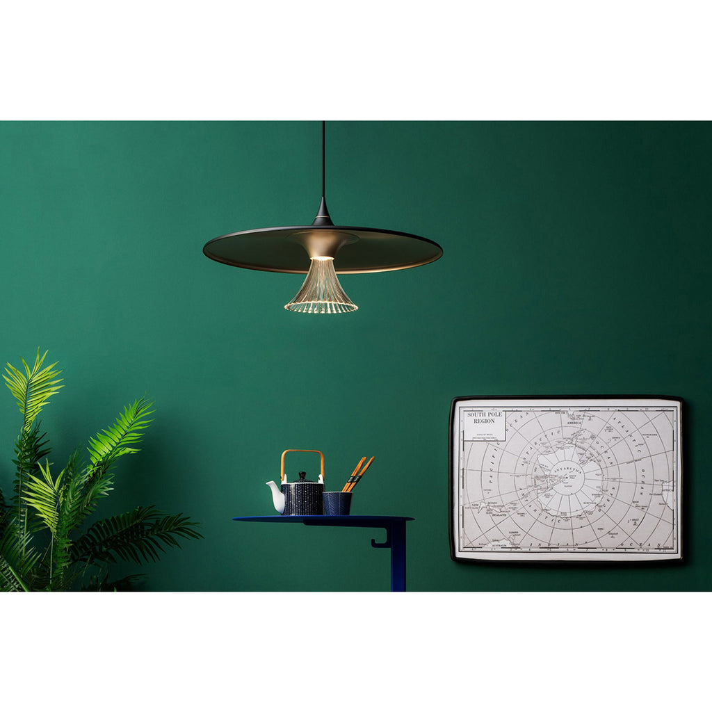 The Ipno Suspension features an innovative optical unit that directs and concentrates light with a soft emission through its spiral patterned diffuser. The optical unit works according to a Total Internal Reflection (TIR) principle to direct the emission. It comes to life when light passes through the material, but only a minimum rate of light is emitted into the environment in a diffused and uncontrolled manner. Available with a sleek Black and Gold finish that will add elegance to any interior.
