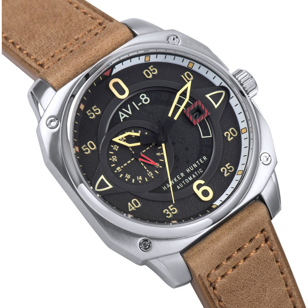 AVI-8 focuses on functionality with the Hawker Hunter AV-4043-01 Automatic Watch. AVI-8 crafted this watch with a black dial housed in a solid stainless steel case. Finished with a Genuine Leather Strap, this timepiece is perfect for any occasion. AVI-8 makes sure you'll always be on time with precise Japanese Automatic movement.