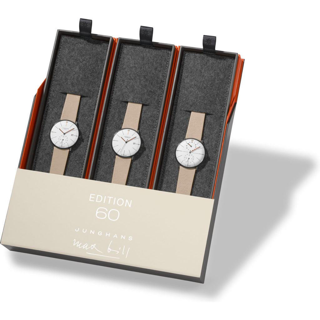 The 60th anniversary of our max bill wristwatches has inspired us to create a special Edition Set. Each watch is individually packaged in its own box with the edition presentation. A total of three items make up the Edition Set limited to 1060 units.