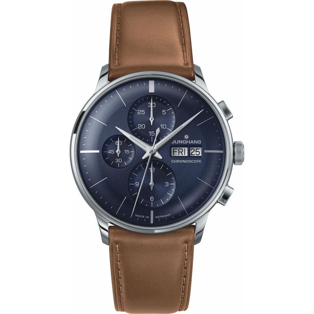 The Junghans Meister Chronoscope 027/4525.01 is a great mechanical (automatic) chronograph from the Meister-series. A watch for the professional gentleman with suave looks that go above and beyond smart and stylish. An expertly crafted mechanical watch with self-winding movement and displays for day, date and silver appliqués around the sunray brush blue dial. Encased in stainless steel and finished with brown horseskin band this watch is a superb piece. The fascia is laid out beautifully, with sleek stainless-steel detailing providing a modern, minimalist style with a hint of vintage. A domed glass cover really provides a unique look, showing off the watch from any incredible angle. Features include a chronograph, handsome day/date combination display, glowing hands, 30 M water-resistance and an automatic movement.