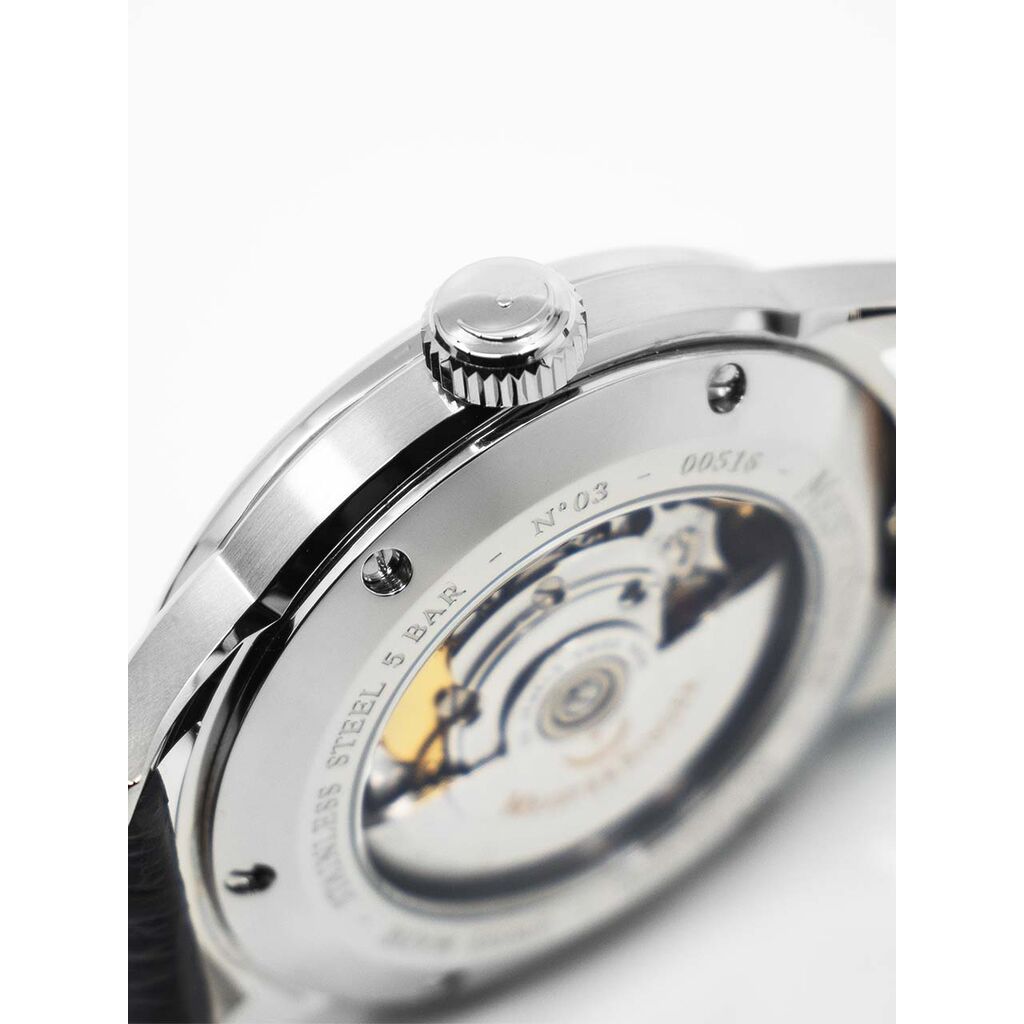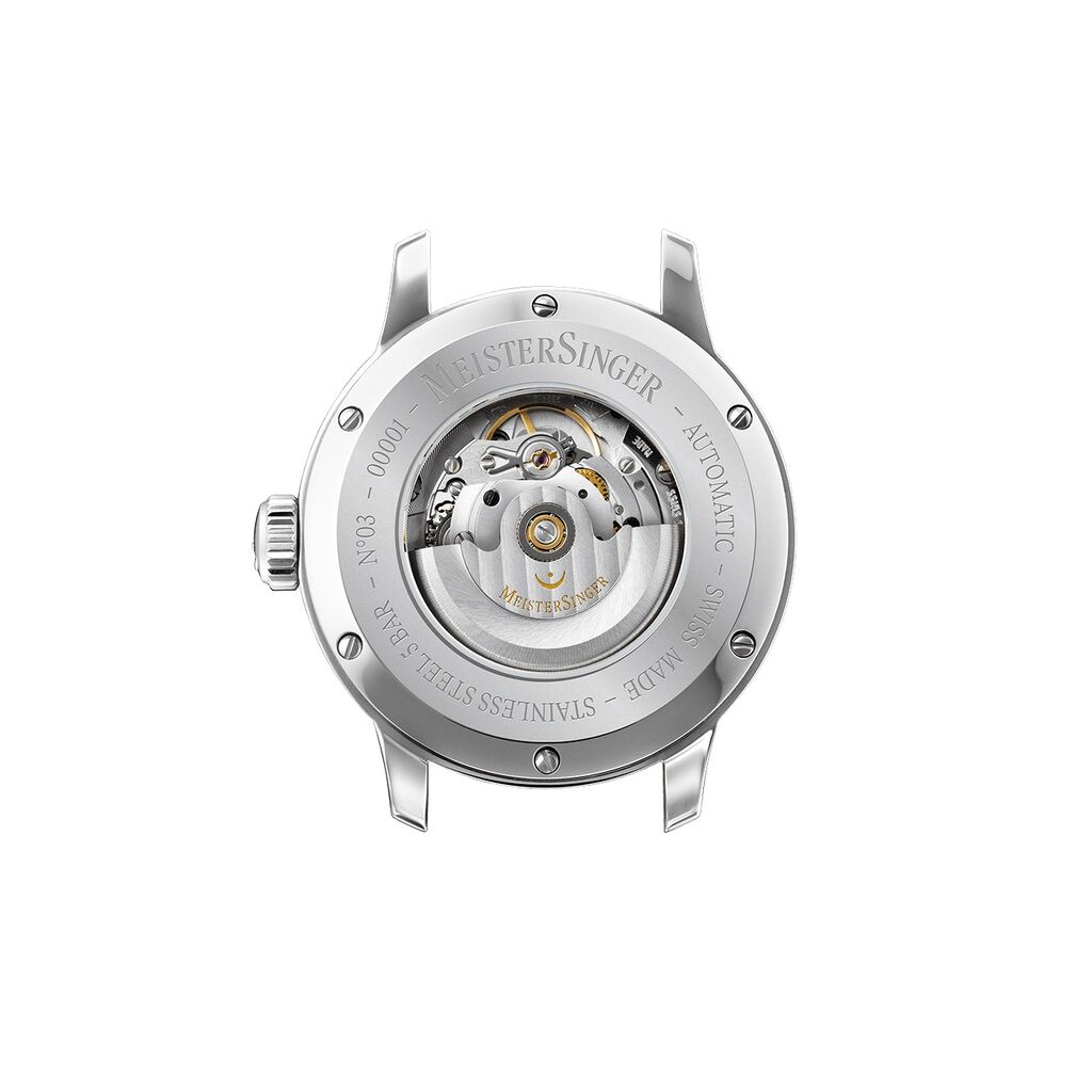 The MeisterSinger N° 03 combines the aesthetic principles of the modern single-hand watch with a highly energy-efficient drive in the form of a Swiss automatic movement that draws its power from the activity of the wearer. Under the sixfold screwed glass exhibition back of the watch, the centrally mounted oscillating rotor can be observed as it transmits its energy to the mainspring barrel, which can accumulate up to 38 hours of power reserve. The N° 03 received the GOOD Design Award and was nominated for the German Design Award for its consistent design, its functional typography featuring a complete set of double-digit hour numerals, and the needle-shaped hour hand, which indicates the exact time down to five minutes on the circumferential minute scale.