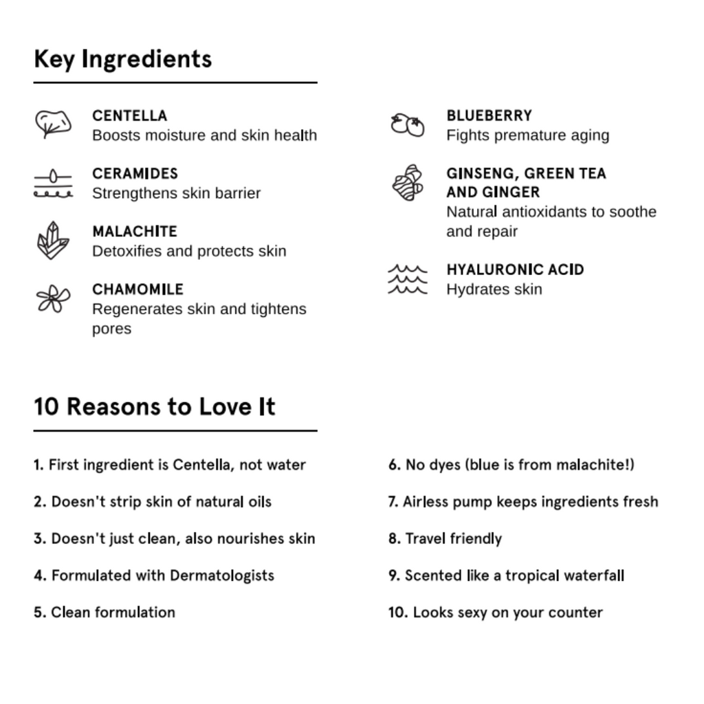 Ingredients: Centella Asiatica Extract, Water, Lauryl Betaine, Disodium Laureth Sulfosuccinate, Acrylates Copolymer, Coco-Glucoside, Disodium Cocoamphodiacetate, Sodium Chloride, 1,2-Hexanediol, Polyglyceryl-4 Caprate, Polyglyceryl-6 Caprylate, Potassium Benzoate, Tromethamine, Fragrance, Hexylene Glycol, Sodium Phytate, Malachite Extract, Glycerin, Caprylic/Capric Triglyceride, Butylene Glycol, Ceramide NP, Hydrogenated Lecithin, Chamomilla Recutita (Matricaria) Flower Extract, Panax Ginseng Root Extract, Vaccinium Angustifolium (Blueberry) Fruit Extract, Sodium Hyaluronate, Camellia Sinensis Leaf Extract, Zingiber Officinale (Ginger) Root Extract, Ethylhexylglycerin