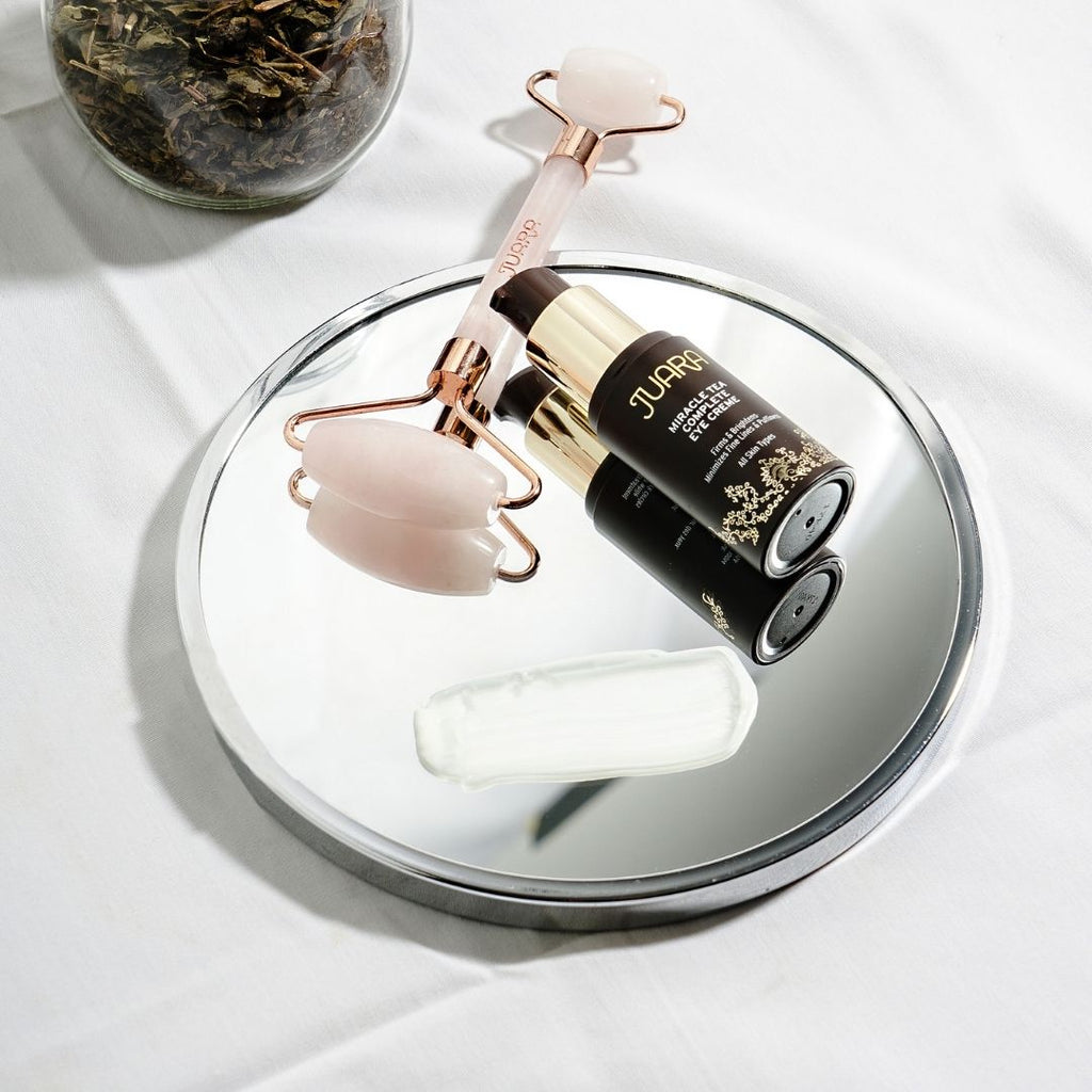 Following cleaning, Miracle Tea Complete Eye Cream can be safely applied on top of JUARA Clove Flower & Turmeric Anti-Aging Serum for the ultimate, tightening, lightening, and brightening treatment. You can also follow with your favorite JUARA moisturizer to lock in hydration and promote an overall glowing complexion.