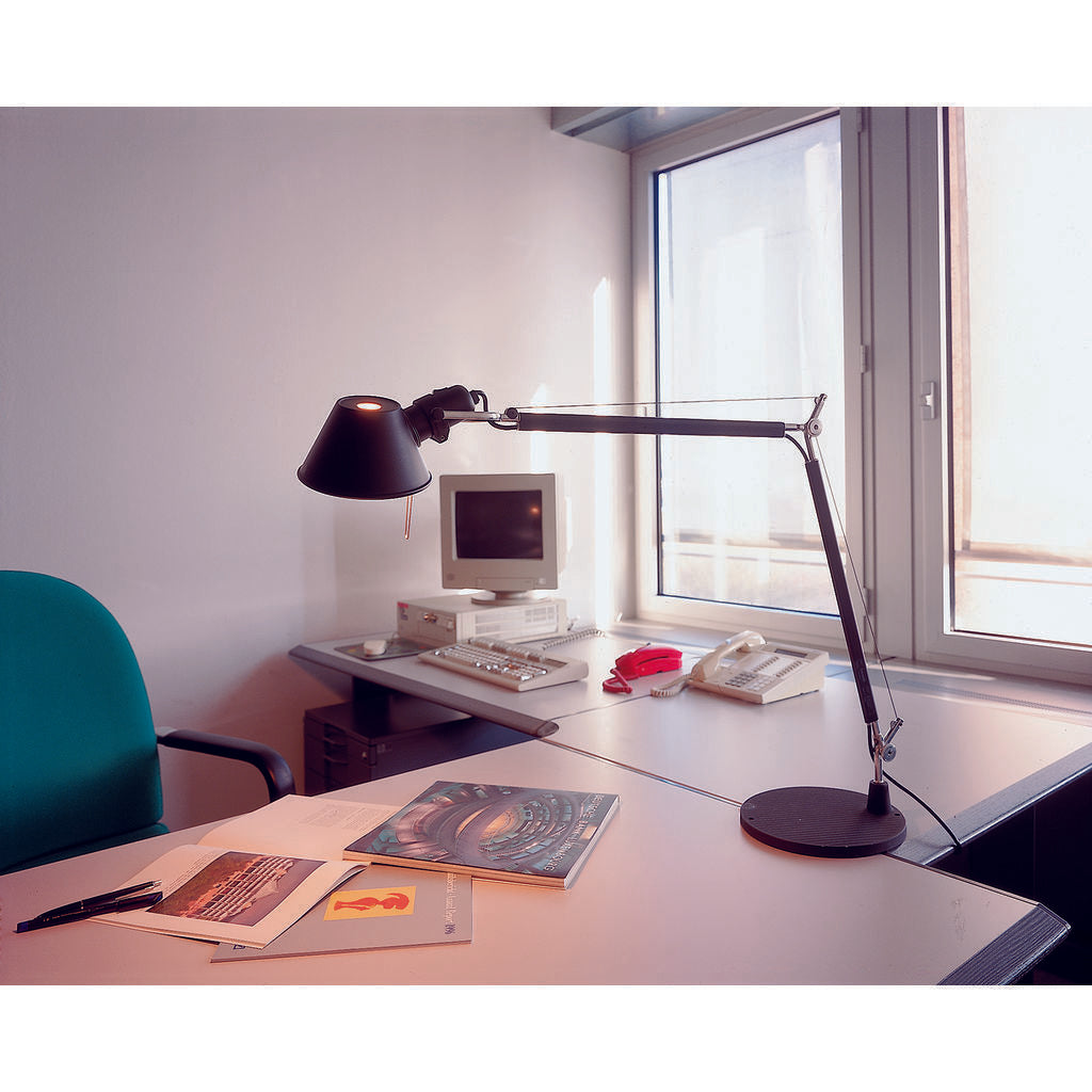 Add a touch of light to any private or professional space with the most sophisticated lamp from Artemide. The Tolomeo Table Lamp with Base come in three different sizes for a particular style that will brighten any dark corner. Features a full adjustable, articulated anodized aluminum arm and body with die-cast aluminum joints and tension control knobs. Monochromatic colors with a matte finish complete the look in any room.