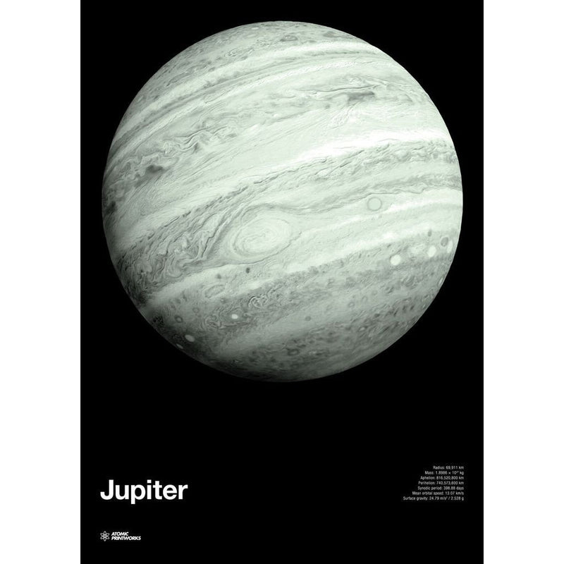 The Jupiter Educational Poster From Atomic Printworks offers a detailed view of the planet Jupiter with a luminous phosphorescent coating thats comes to life whenever the lights go out! Featuring details about Jupiter's planetary radius, mass, and orbit pattern, this glow in the dark poster is informative as well as aesthetically pleasing.