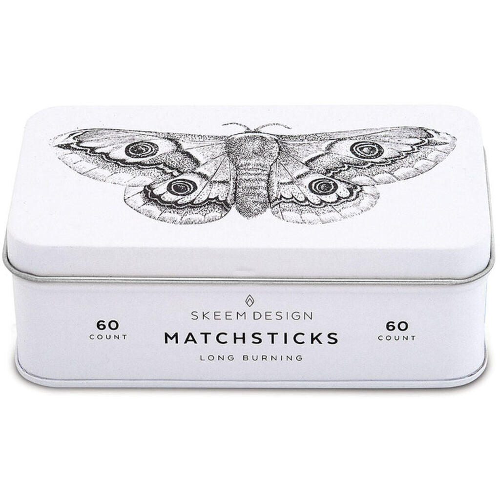 Our printed moth match tin, holds 60, 4" matches with white tips. Each tin has a strike pad built into the tin so you always have a light close at hand. You will never want to banish these matches to your junk drawer; they are too pretty to put away and are the perfect add-on to our Citronella Candle Collection.