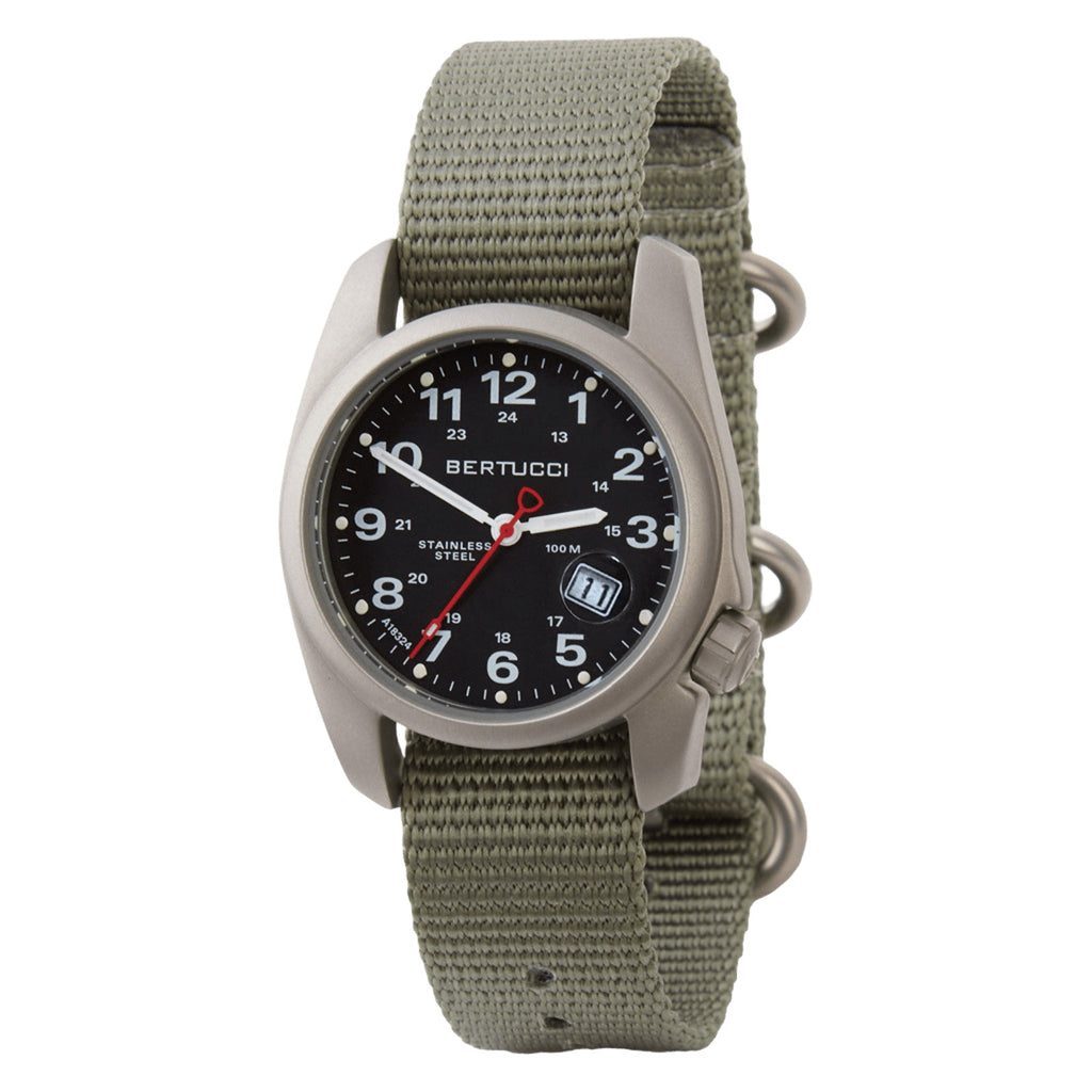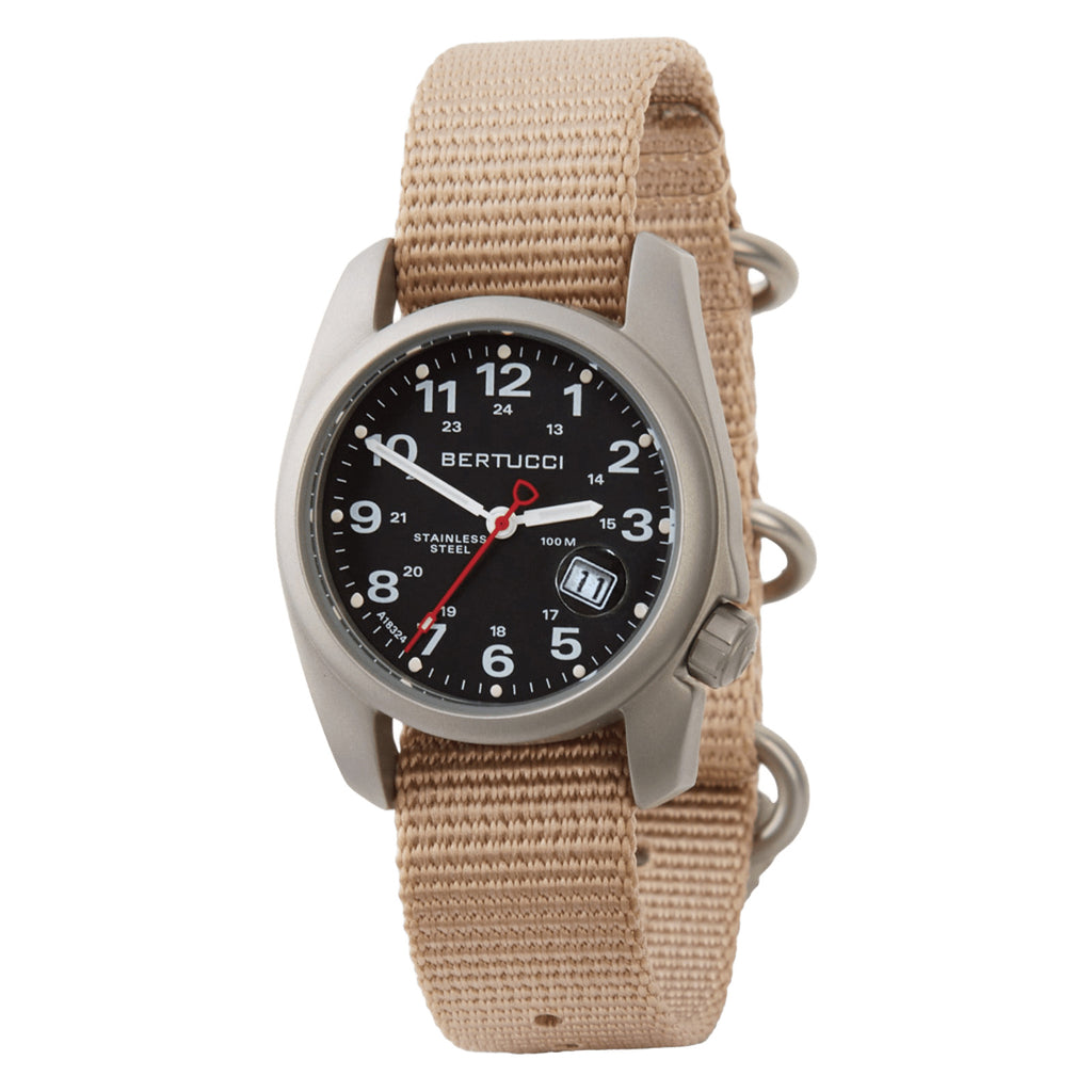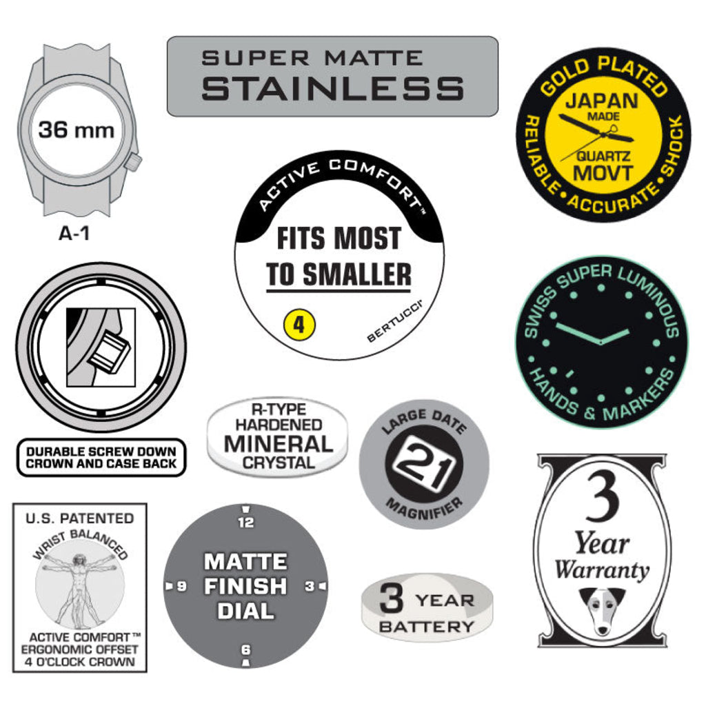 The A-1S Super Field™ features a traditionally sized 36 mm sand blasted matte finish stainless steel case. A true classic based on essential function well done - featuring durability, reliability, comfort, a clean easy-to-read dial, and large date with a magnifier that increases visibility 2.5 times. Field duty equipped with rugged screw down crown & case back, 100 M water resistance, U.S. Patented Unibody™ case, long lasting B-Type nylon webbing band, R-Type hardened mineral crystal, precision gold plated movement, and Swiss super luminous hands & markers.