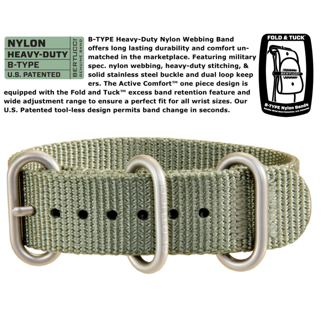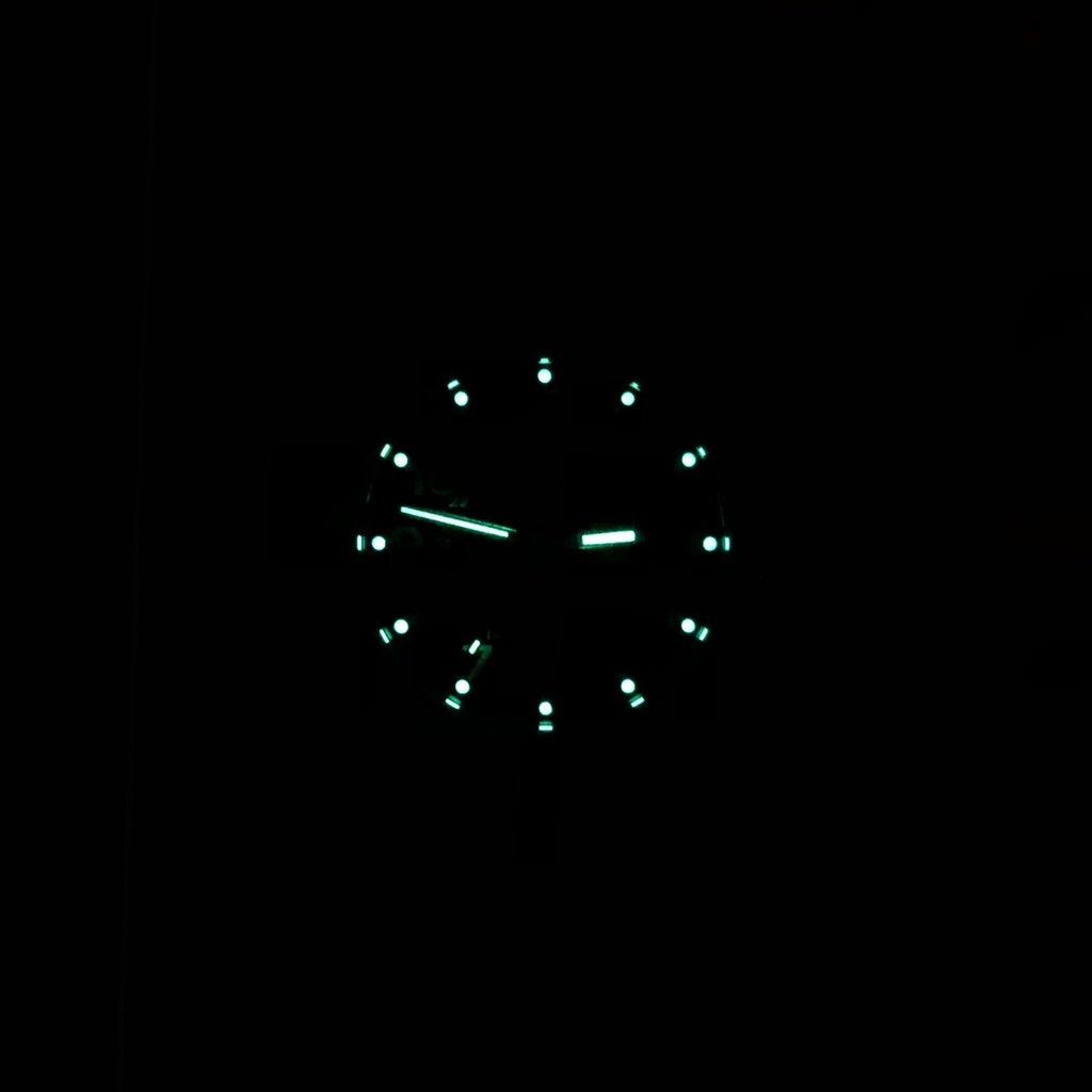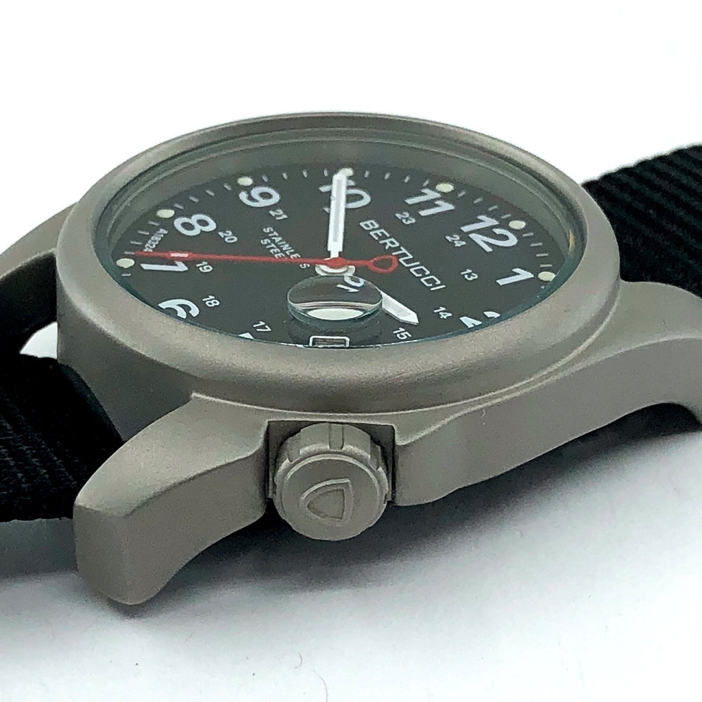 The A-1S Super Field™ features a traditionally sized 36 mm sand blasted matte finish stainless steel case. A true classic based on essential function well done - featuring durability, reliability, comfort, a clean easy-to-read dial, and large date with a magnifier that increases visibility 2.5 times. Field duty equipped with rugged screw down crown & case back, 100 M water resistance, U.S. Patented Unibody™ case, long lasting B-Type nylon webbing band, R-Type hardened mineral crystal, precision gold plated movement, and Swiss super luminous hands & markers.