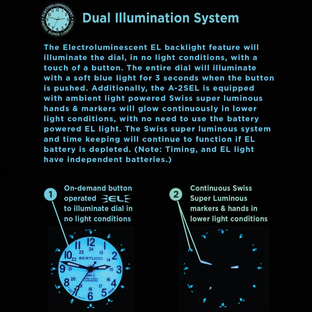 The A-2SEL Super Illuminated™ has a classic and functional design optimized for all light conditions. Featuring an on demand battery-powered electroluminescent EL backlight that will illuminate the entire dial with an optically correct soft blue light with a simple push of the button, and Swiss super luminous lighting for hands & markers that will glow continuously in all light conditions. This design approach is superior as timing is driven by a separate battery, the EL function has a dedicated second battery and the luminous is not dependent to a battery.