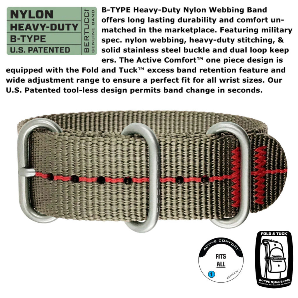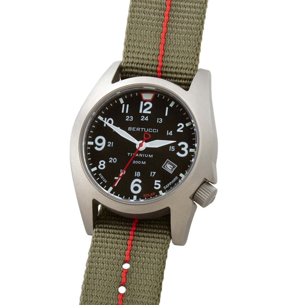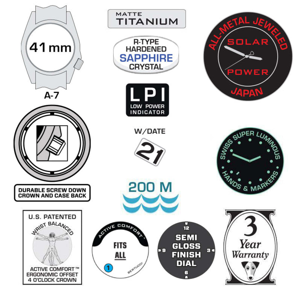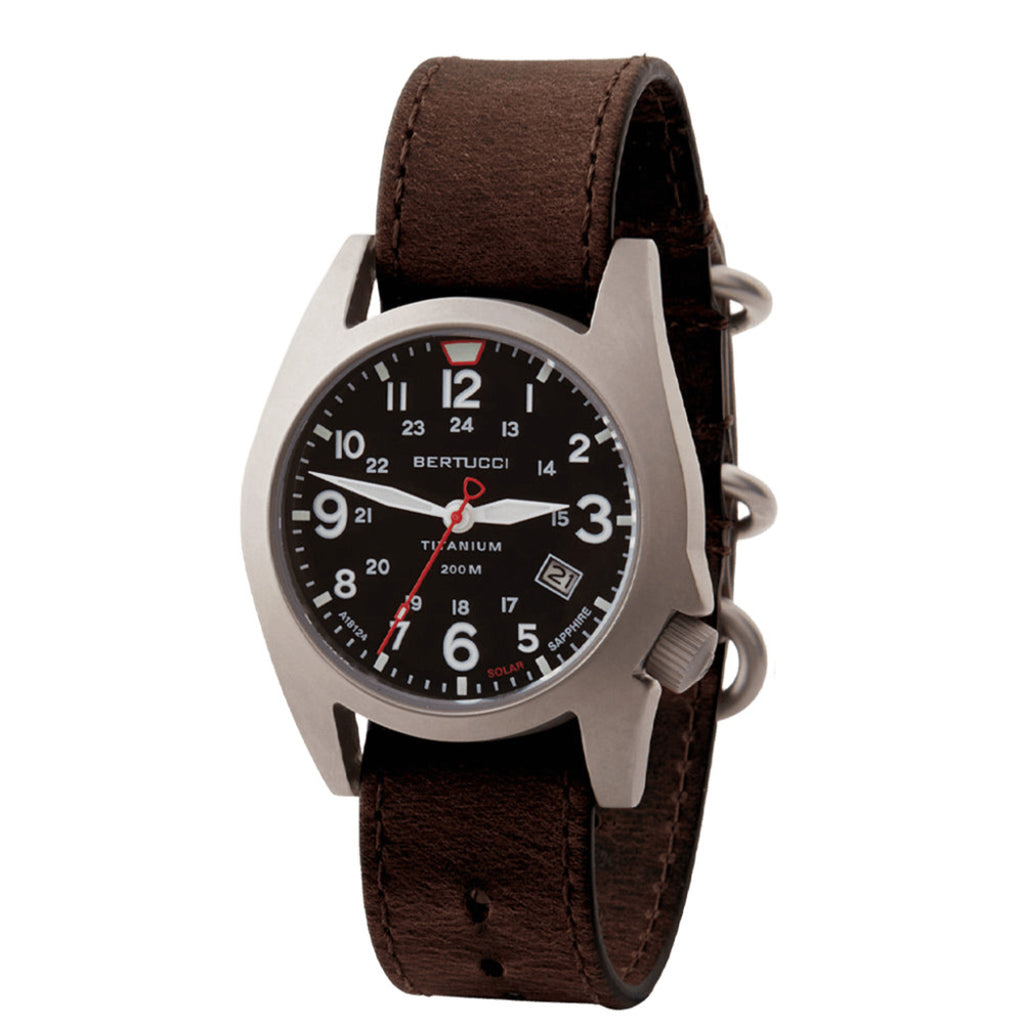 The Bertucci® A-7TS RETROSPEC™ Solar field watch features a solid titanium U.S. Patented Unibody™ 41 mm case that is a clean functional design with a retro feel. It is equipped with a precision solar powered all-metal movement that has 6 month power reserve, excellent accuracy & reliability... and requires no battery changing or charging. The matte finish titanium case offers excellent durability and lightweight comfort. The functional high contrast dial is easy to read and offers 12-24 hour time w/ date. Also, equipped with a scratch resistant R-Type sapphire crystal, rugged screw down crown & back, Active Comfort™ band, Swiss super luminous hands & markers, & 200 M water resistance.