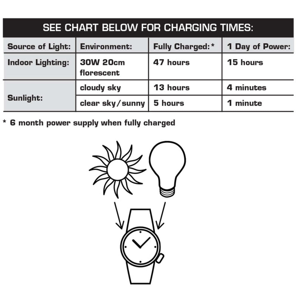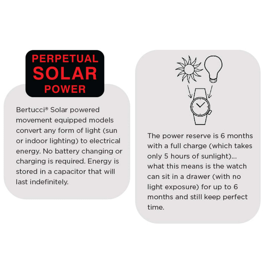 Bertucci® Solar movement equipped field watches convert any form of light (sun or indoor lighting) to electrical energy. No battery changing is required. Energy is stored in a capacitor that will last indefinitely. In certain very rare conditions, this environmentally friendly capacitor, may need to be replaced. The solar movement meets the Bertucci® accuracy requirement for all movements of +/- 20 seconds per month accuracy.