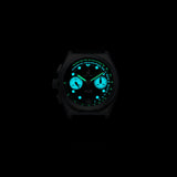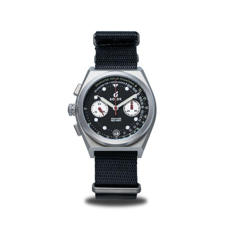 Utilizing an ultra-tough & super light 38mm titanium case, the Destro is powered by a SII VK64 Mecaquartz chronograph movement. Use the precisely graduated markings on the reverse panda dial to count off heart and respiratory rates within a matter of seconds. When activating the chronograph, we'd recommend counting using 30-second intervals for higher accuracy.