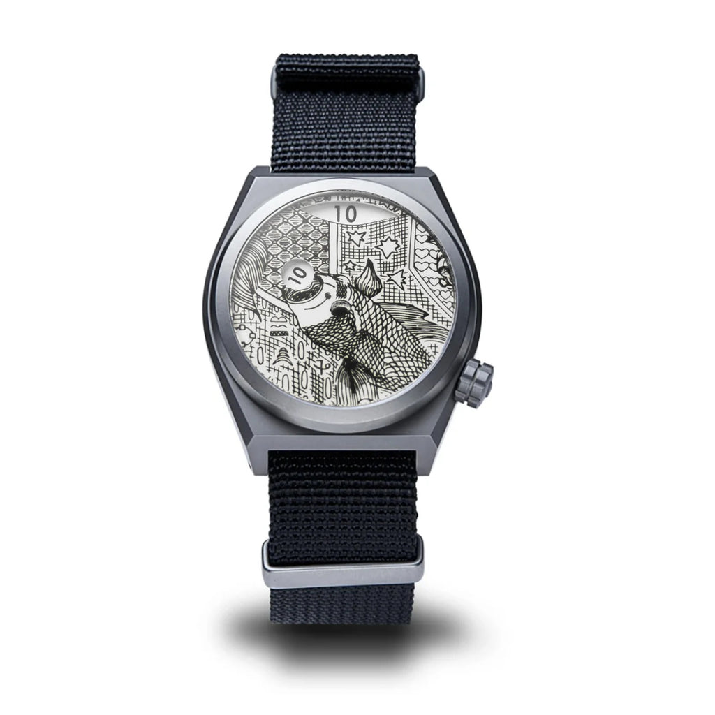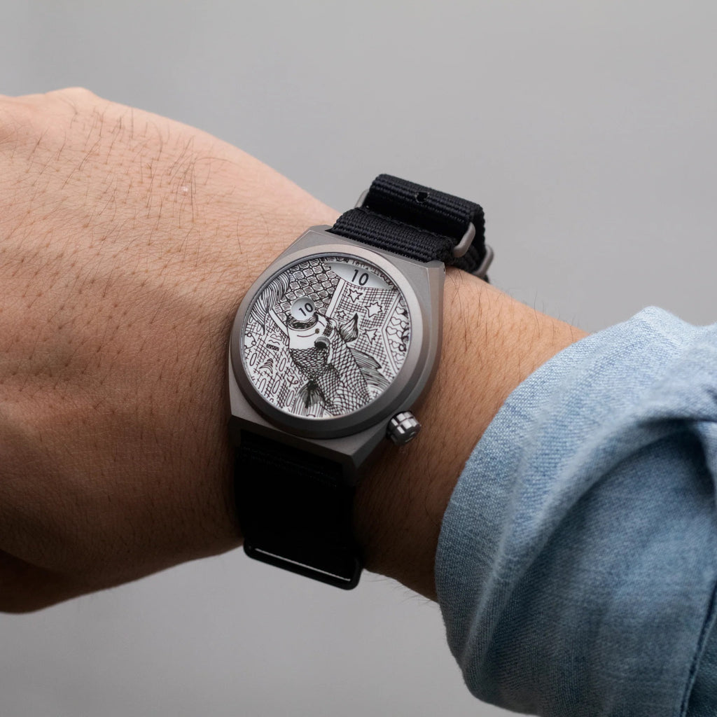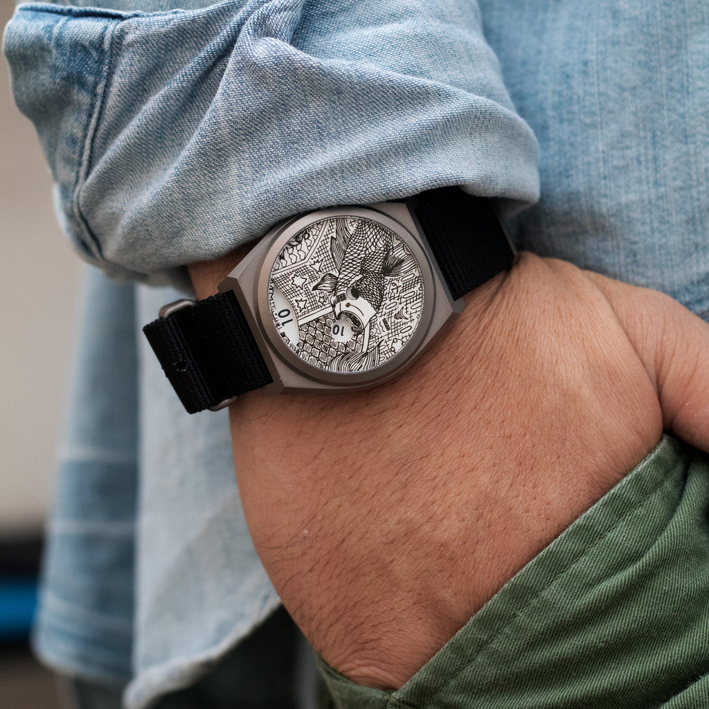 This special edition Venture is the first to feature a rotating disc dial to allow a wider display area for Art's lucky Koi fish. May it bring you strength & good luck!