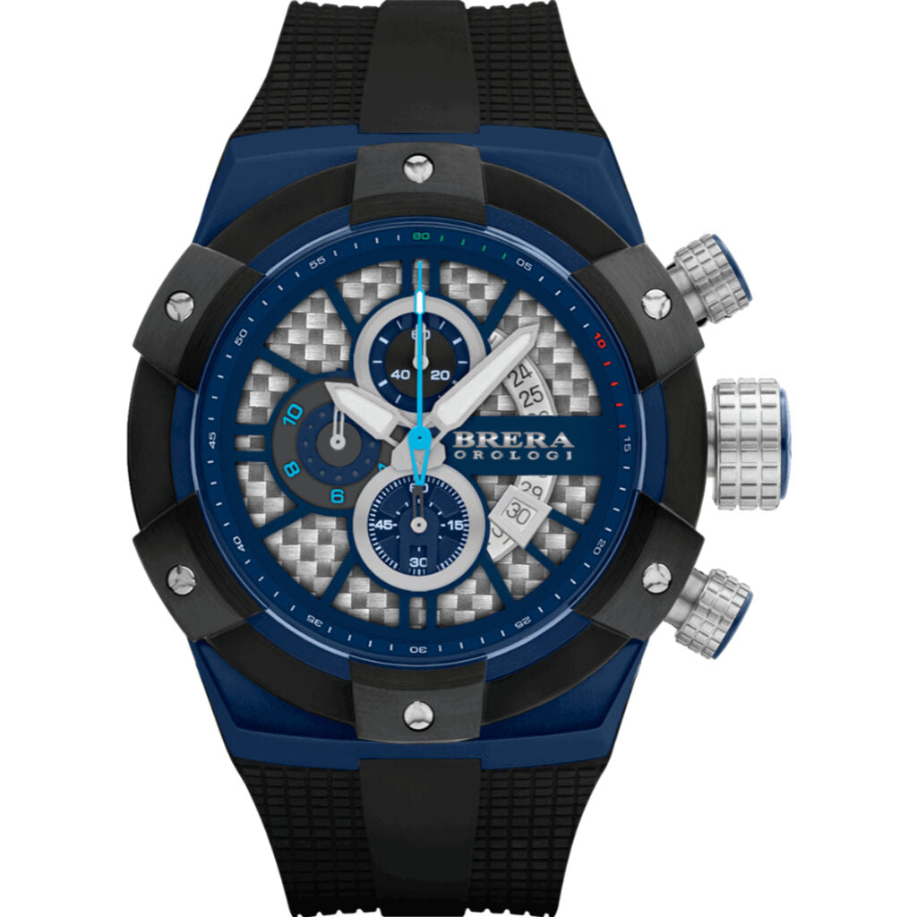 48mm and forged of 316L (stainless steel) Supersportivo demands attention and dominates the road or in this case, wrist. There are sports cars and supercars made all over the world, but Italians seem to understand how to make them pull on drivers’ heartstrings like nobody else. Italian cars have unique design profiles and always stand out in a crowd. The X factor that seems so elusive stems from being Italian. Trying to emulate the supercar feeling without the context of the Italian culture is nearly impossible. The super sport package typically includes high-performance tires, heavy-duty suspension, and increased power, along with a variety of other performance and appearance upgrades. These elite machines set new standards for production and unique styling, along with the highest measure of handling and performance available. Pure production racers with the minimum of concessions to make them street legal. The super sport are the most powerful, fastest, and sought after super machines in the world. Competition here is fierce. The oversized, manifold-style case construction creates an aggressive, disruptive design. Paired with smooth lines, subtle polishing, and delicate details, such as custom BRERA OROLOGI screws, Supersportivo captivates with a charisma all its own. Under a scratch resistant, antireflective c. sapphire crystal and triple-layer dial with wire framework, large sub-dials, and an exposed date disk, Supersportivo is powered with a quartz chronograph movement with everything needed to keep pace.