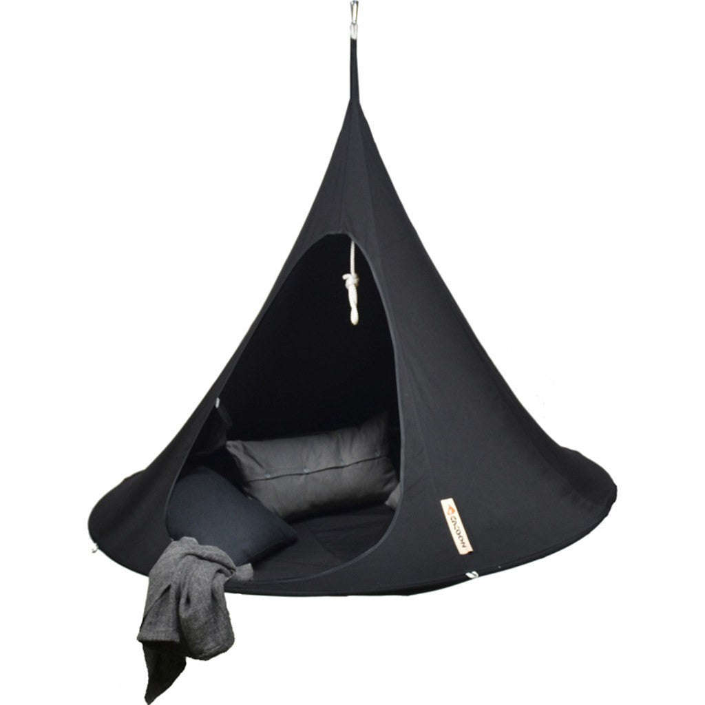 Cacoon created a larger version of their single hanging hammock for a little extra space. The Double Hanging Hammock in Black is constructed with heavy duty materials and repels water. Whether you put it in the livingroom, hang it from a tree in your backyard or take it to the beach, the Double Cacoon is a great option for staying cozy anywhere you go.