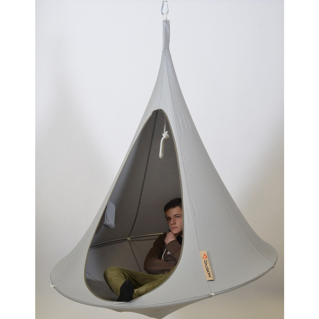 The Single Hanging Hammock is where everything began for Cacoon. This Light Grey version is constructed with heavy duty materials and repels water. Whether you put it in the living room, hang it from a tree in your backyard or take it to the beach, the Single Cacoon is a great option for staying cozy anywhere you go.
