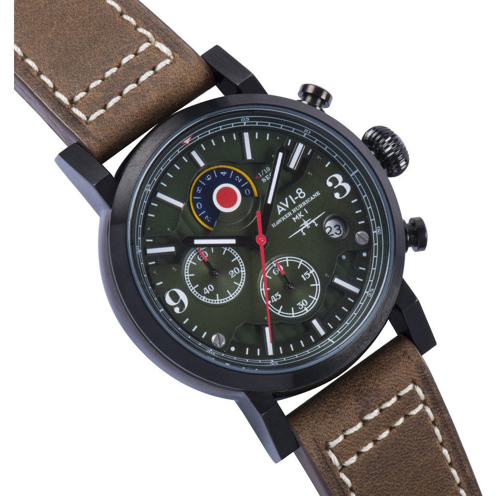 AVI-8 focuses on functionality with the Hawker Hurricane AV-4041-04 Chronograph Watch. AVI-8 crafted this watch with a layered green dial housed in a solid stainless steel case. Finished with a Genuine Leather Strap, this timepiece is perfect for any occasion. AVI-8 makes sure you'll always be on time with precise Japanese Quartz Chronograph movement.