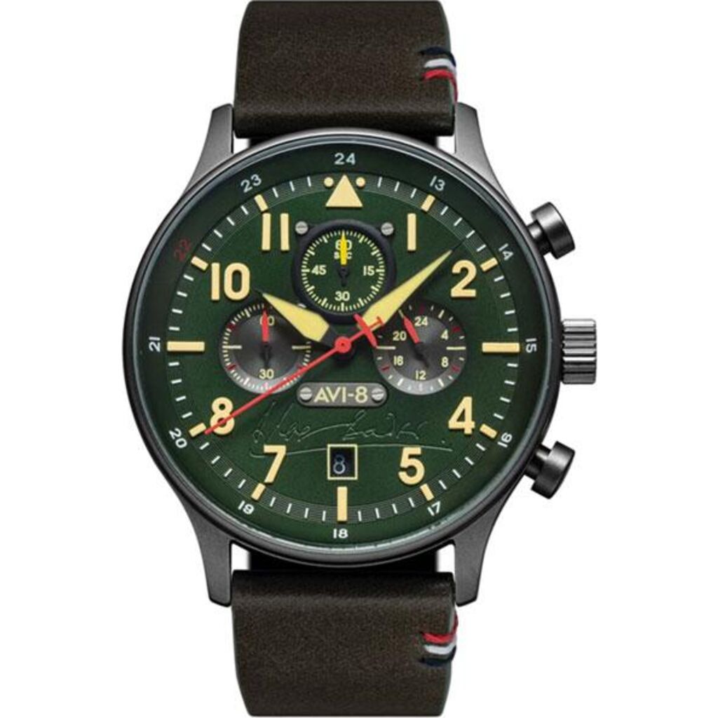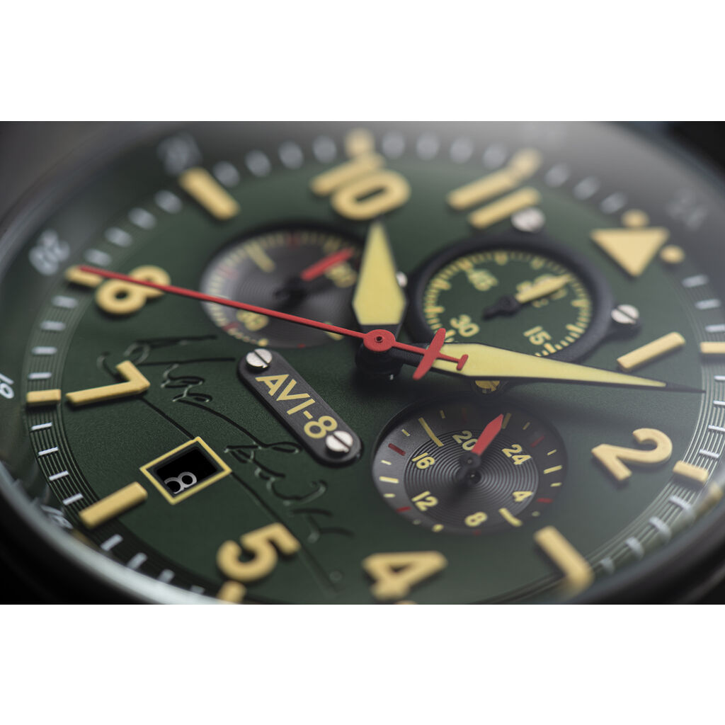 The AVI-8 Hawker Hurricane Sir Douglas Bader Chronograph watch is a unique collaborative timepiece that commemorates and draws inspiration from the life, times, and ethos of Sir Douglas Bader (1910 – 1982). The best engineers, scientists, designers, and pilots have combined over the years to produce cutting edge machines that were designed for the crucial purpose of a country's defense. Drawing on the absolute best in materials and resources, a series of iconic planes have emerged over the years that serve as a benchmark to look upon in man's progress in the sky. AVI-8 watches seeks to honor both the aircraft and the untold story of the airmen who have dedicated themselves both in and out of the cockpit to bring these incredible machines to life. This watch has a sixty-minute stopwatch function, a second counter, and a 24-hour sub-dial. The chapter ring also provides a 24-hour time scale. The date is shown at 6:00 on the dial. The stainless steel case is 43mm in diameter and 13mm thick. Tip to tip measure 50mm. Water-resistance is rated at 50 meters but it is not recommended for swimming.