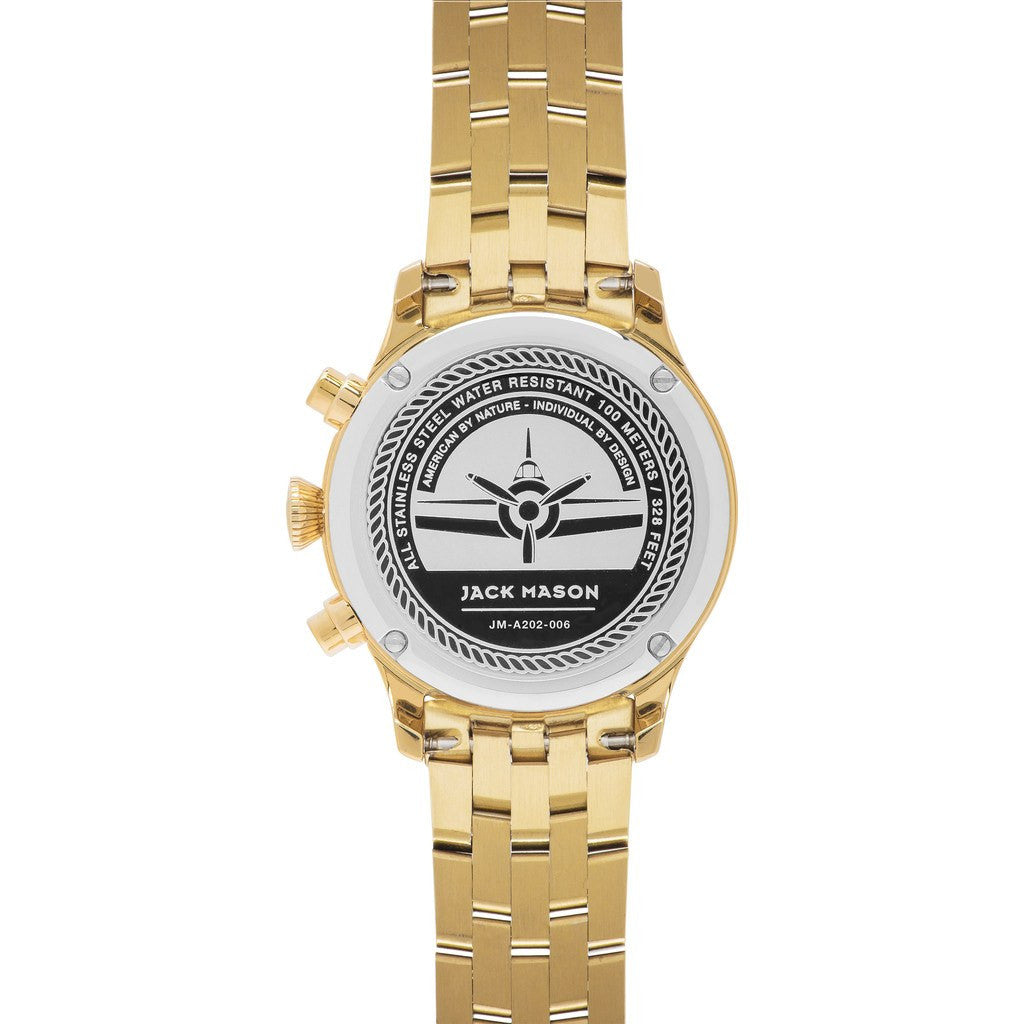 Part of Jack Mason's women's collection, the the Aviator JM-A201-006 Chronograph Watch was designed with the aesthetics of an aircraft in mind. Made with a 36mm case, the watch has a classic, yet contemporary look to it. The Super Luminova markings allow for readability, even in low lighting situations. Jack Mason pays particular attention to the face details, with subtle white, red, and blue markings along the second hand, paying homage to the American flag.