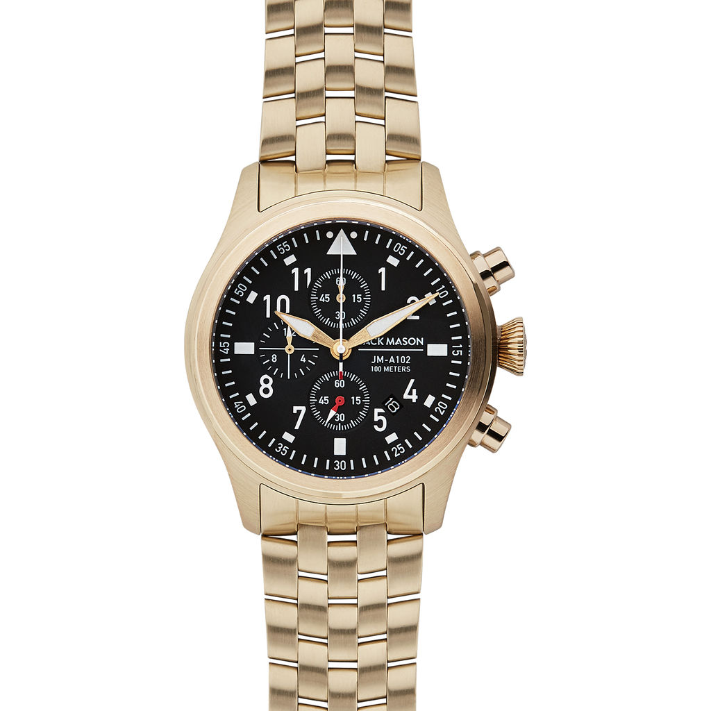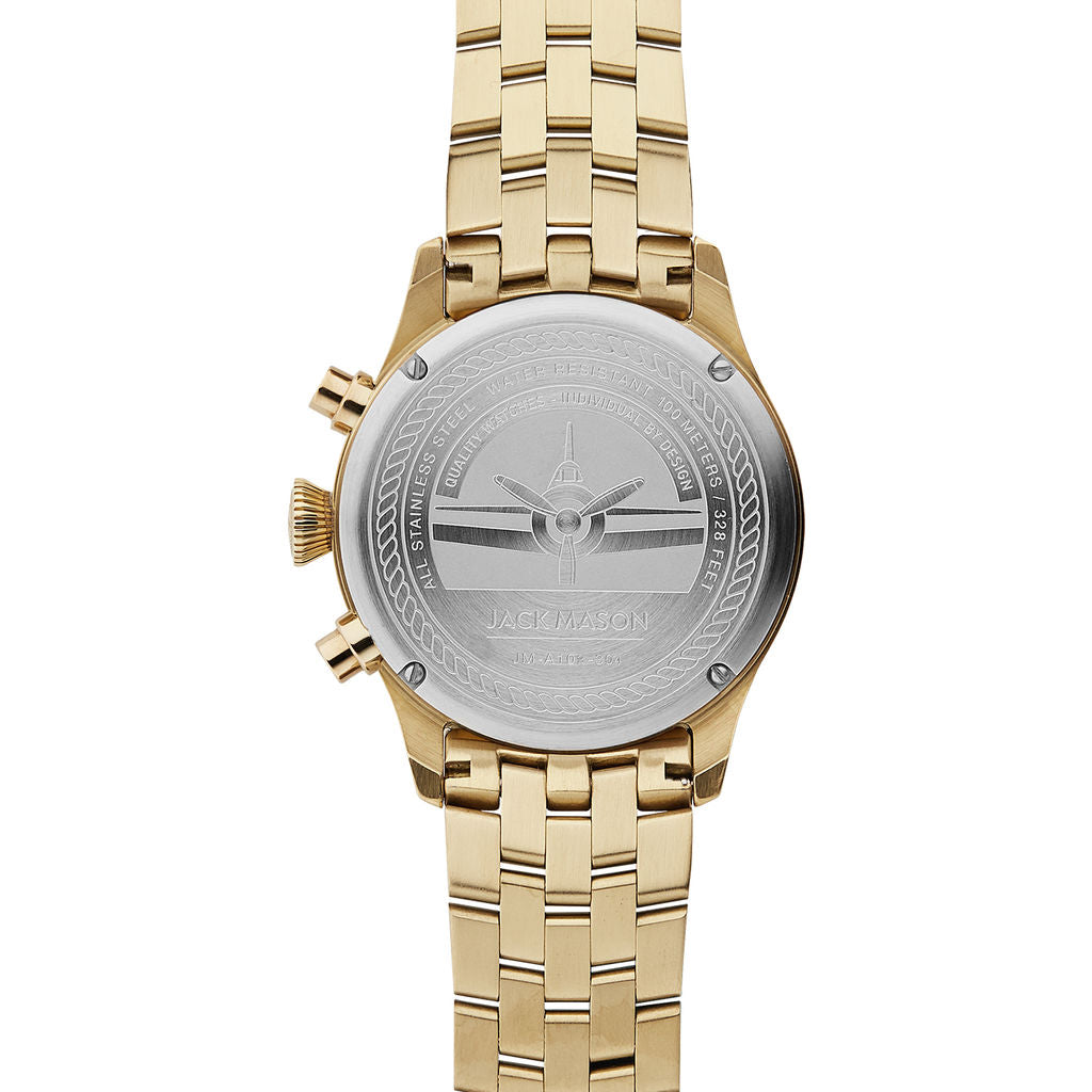 A revamped version of the classic pilot's watch for the modern fashionista, the Jack Mason Black Aviator Chronograph Gold watch is beautiful and functional. The Aviator Chronograph uses subtle details, blending colors and texture to update the classic style without compromising the utility of the original pilot’s watch while being comfortable for everyday wear. The 36mm case is comfortable for everyday wear and features an easy-to-read dial with SuperLuminova markings and applied indices. Relax around water, the Aviator Chronograph watch is water-resistant at 10ATM for comfortable wear when exposed to water. The screw-down case back is etched with aircraft propellers for a final hat tip to the aviator aesthetic and protection.