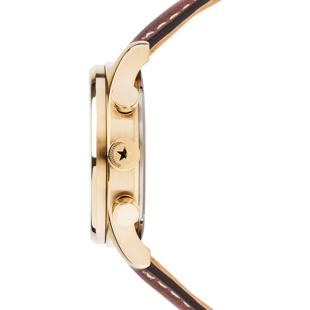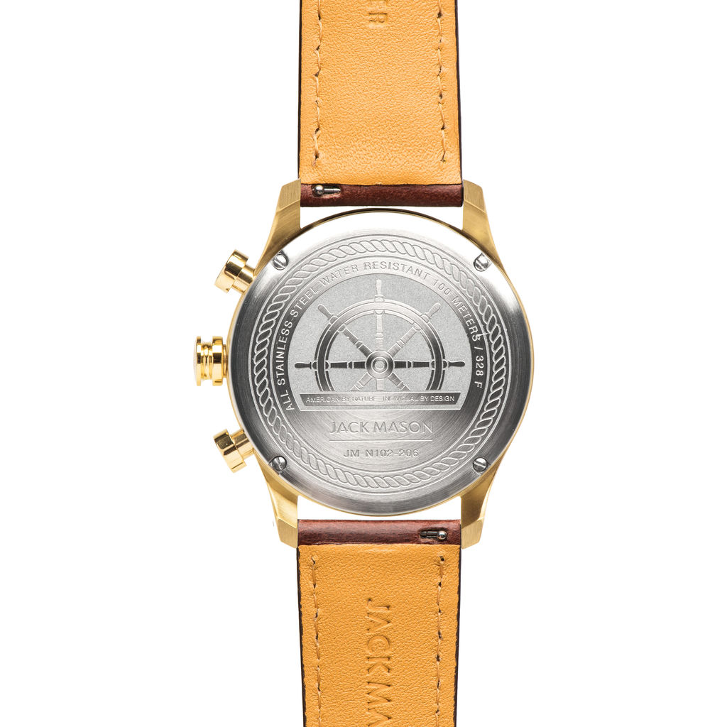Inspired by nautical instruments, the Jack Mason Nautical Chronograph Gold features Super Luminova markings for clear readability, even in low lighting situations. Jack Mason paid particular attention to the face details, with subtle white, red, and blue markings along the second hand, paying homage to the American flag. This model features a black dial paired with a brown leather band for a clean, classic look.