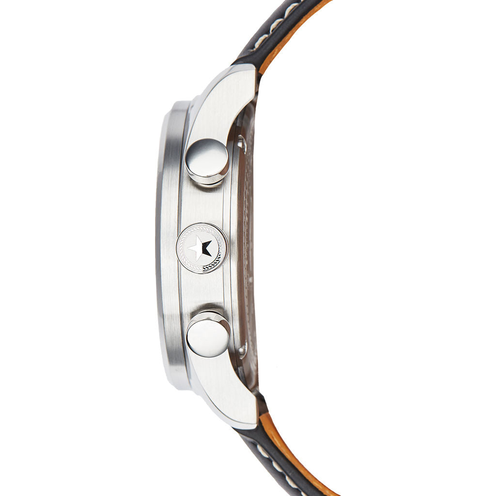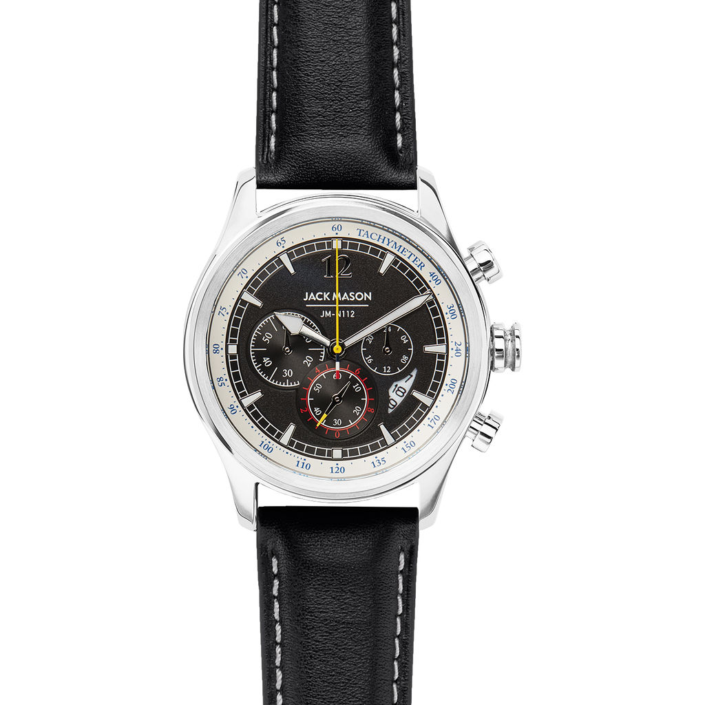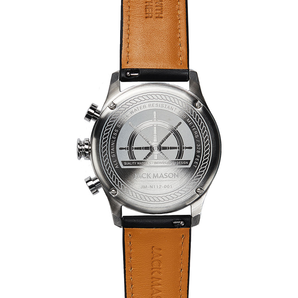 The Nautical Microsecond Chronograph pairs sporting functionality with timeless American design. The complex super runner movement and intricate black dial combine to offer supreme accuracy as the second hand counts down to 1/20th of a second. Superluminova markings and a bold tachymeter add the finishing touches to this striking timepiece. The elegant black leather band can be swapped out with any 22mm Jack Mason strap making this a suitable choice for land, sea, brunch, or even a night out.