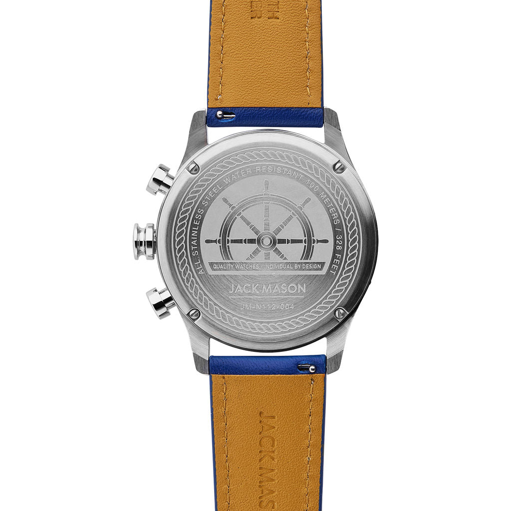 The Nautical Microsecond Chronograph pairs sporting functionality with timeless American design. The complex super runner movement and intricate white/blue dial combine to offer supreme accuracy as the second hand counts down to 1/20th of a second. Superluminova markings and a bold tachymeter add the finishing touches to this unique timepiece. The striking cobalt blue leather band can be swapped out with any 22mm Jack Mason strap making this a suitable choice for land, sea, brunch, or even a night out.