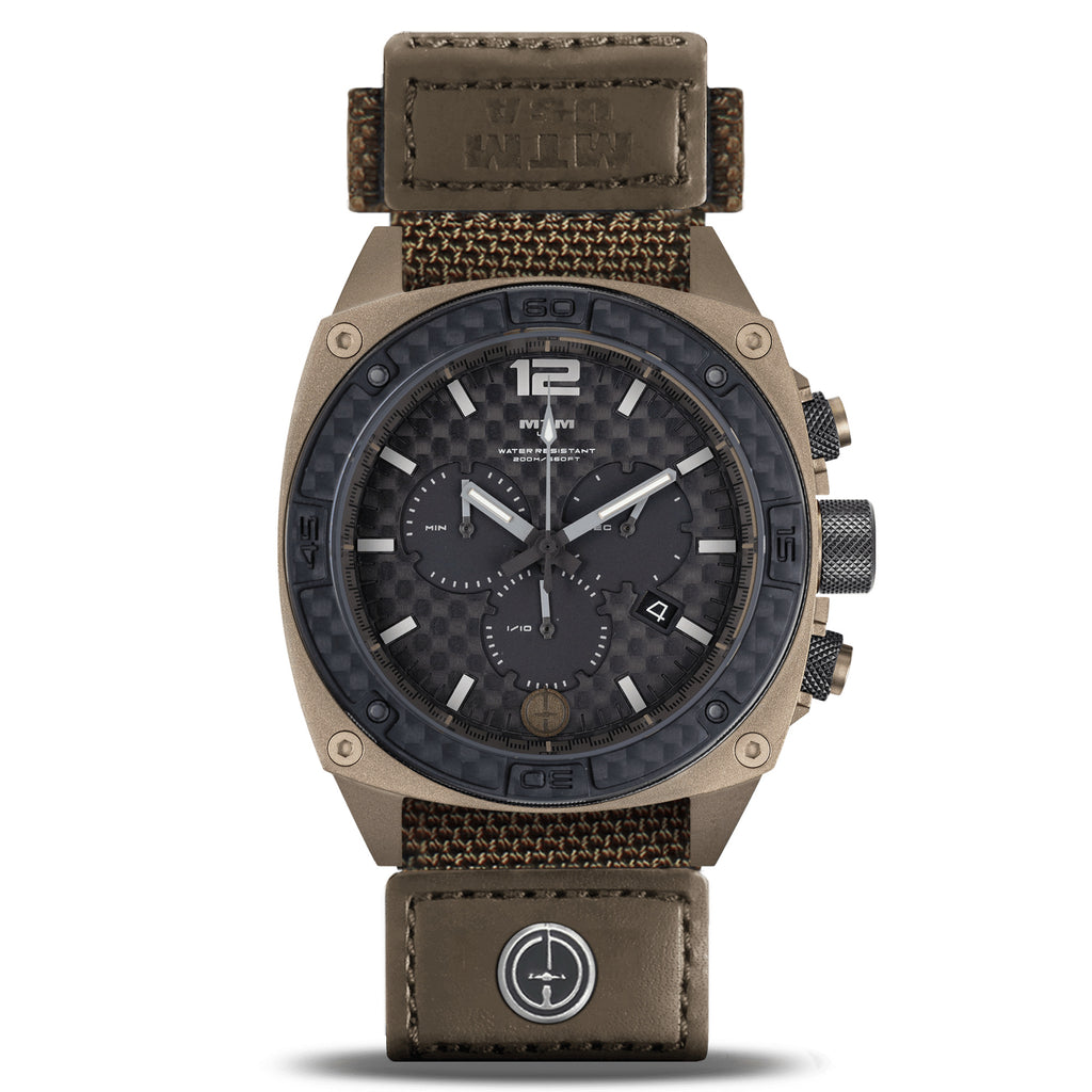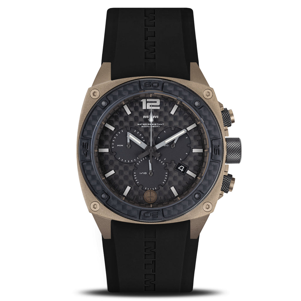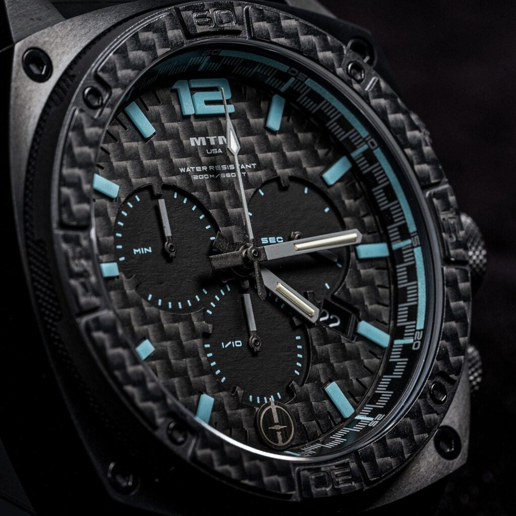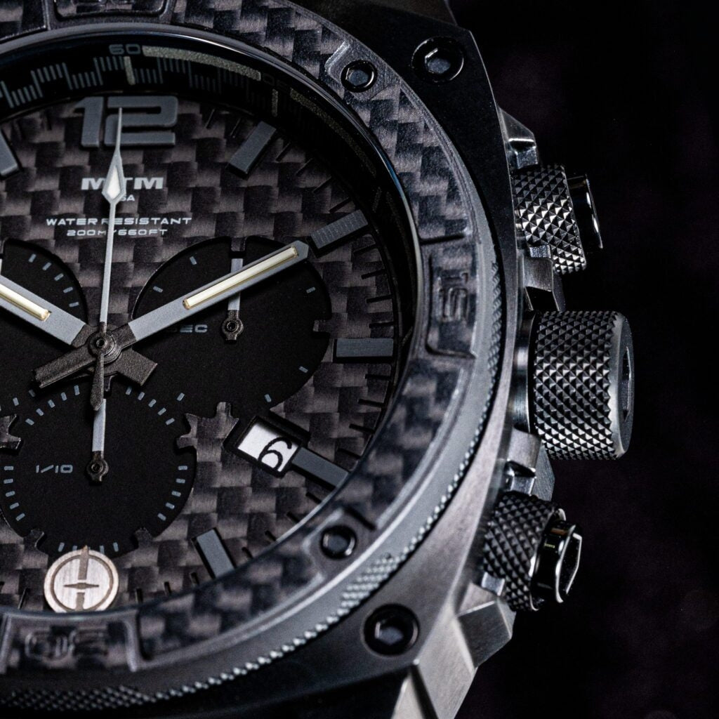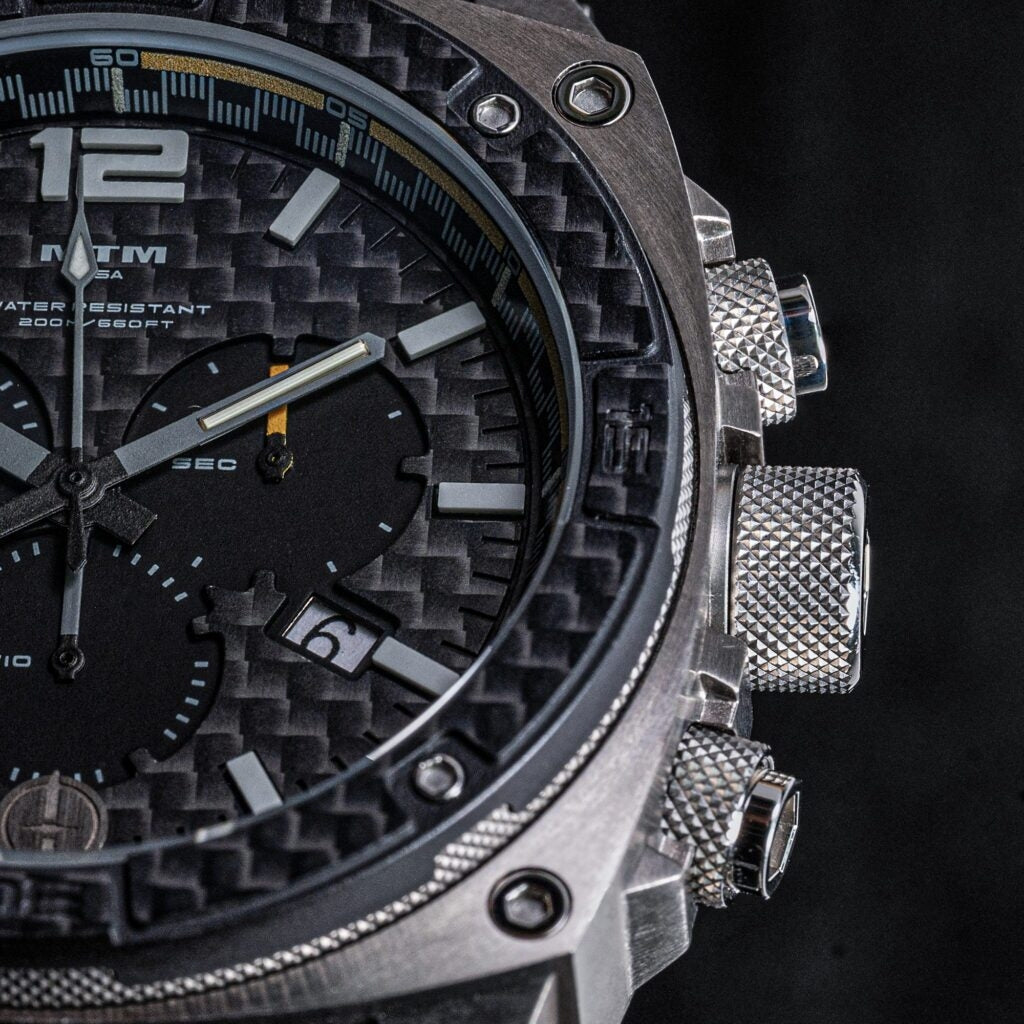 The reinvented MTM Special Ops Carbon Predator II Titanium Watch in DLC finish with Carbon Dial and rotating Bezel sets the standard by which all others will be judged. The MTM Carbon Predator chronograph watch is an empowering timepiece that is durable by nature. Built into this Special Ops watch are three additional Swiss quartz chronograph sub-dials, measuring time down to one-tenth of a second. Its tritium tube hands offer a nice glow so the watch wearer can quickly and easily see the time at night. A watch this strong and rugged can perform in depths up to 660 feet/200 meters. Other prominent features include its rotating carbon fiber bezel, sapphire crystal glass, and locking screw-down crown and buttons.