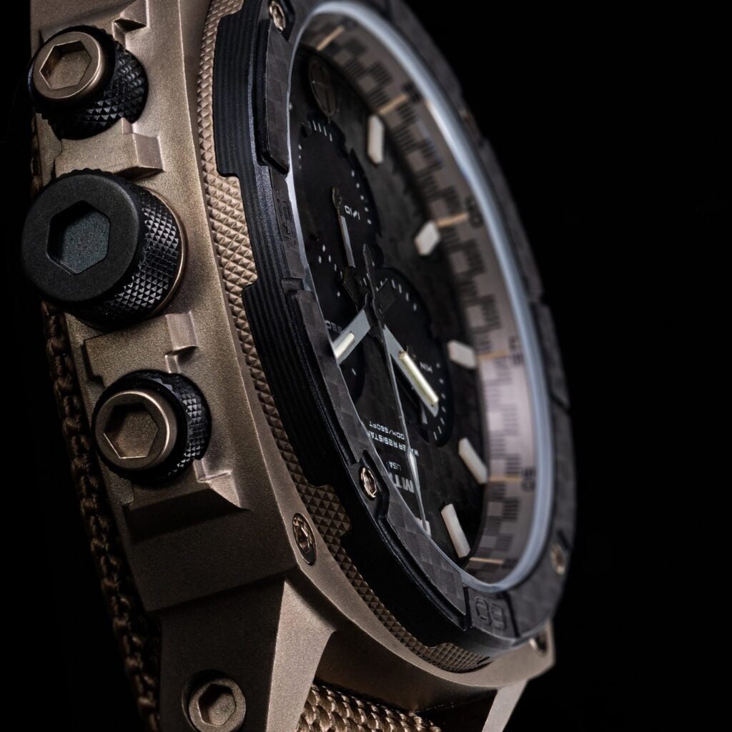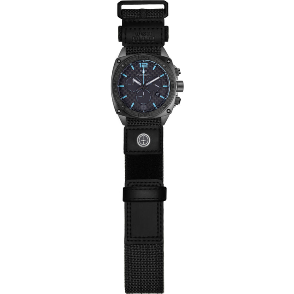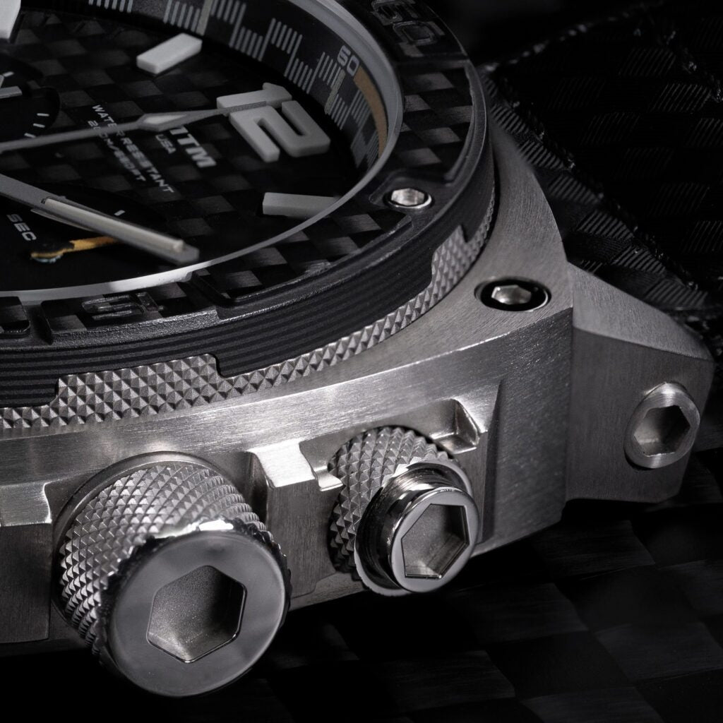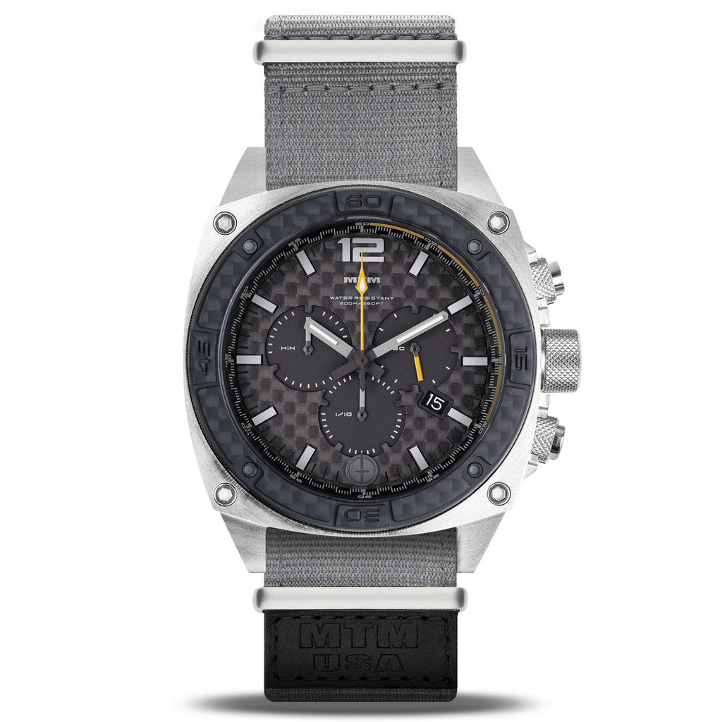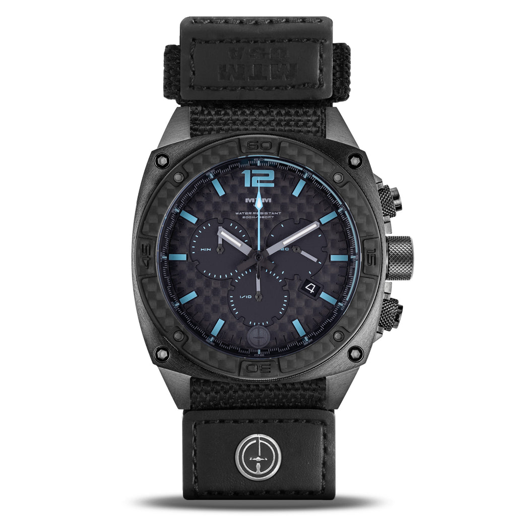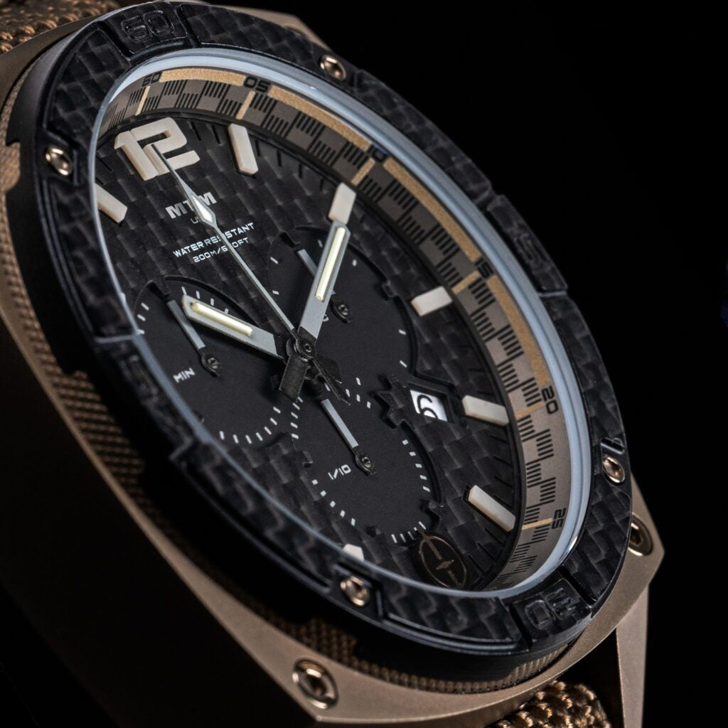 The reinvented MTM Special Ops Carbon Predator II Titanium Watch in DLC finish with Carbon Dial and rotating Bezel sets the standard by which all others will be judged. The MTM Carbon Predator chronograph watch is an empowering timepiece that is durable by nature. Built into this Special Ops watch are three additional Swiss quartz chronograph sub-dials, measuring time down to one-tenth of a second. Its tritium tube hands offer a nice glow so the watch wearer can quickly and easily see the time at night. A watch this strong and rugged can perform in depths up to 660 feet/200 meters. Other prominent features include its rotating carbon fiber bezel, sapphire crystal glass, and locking screw-down crown and buttons.