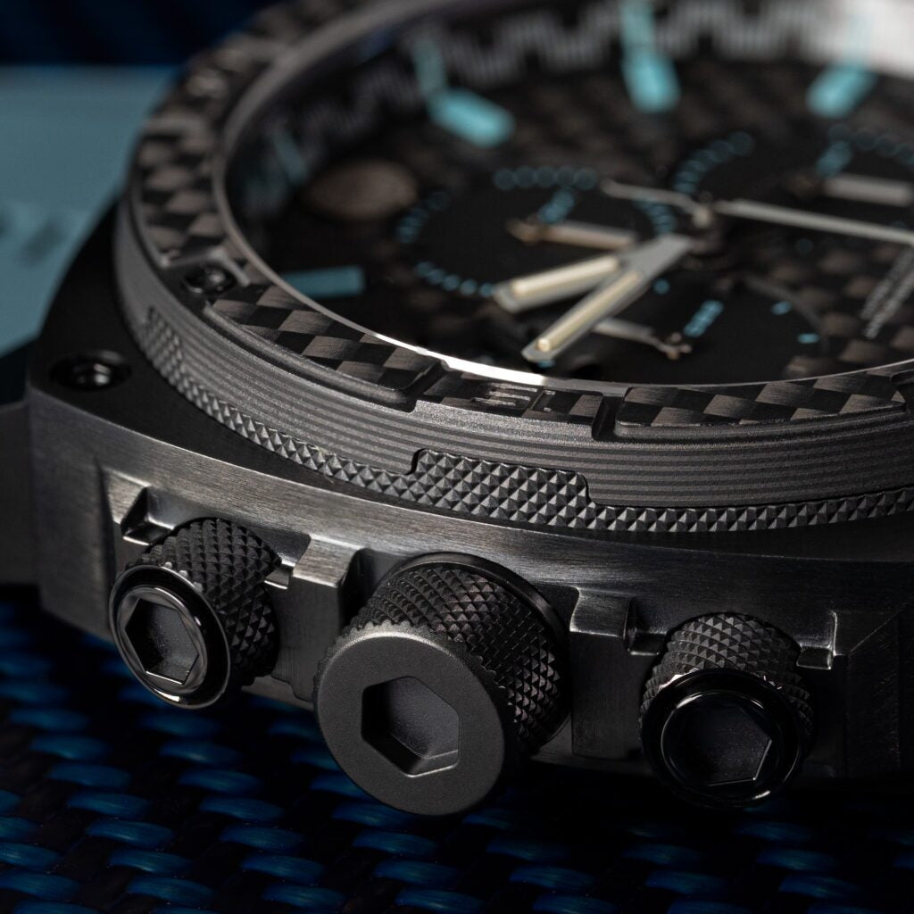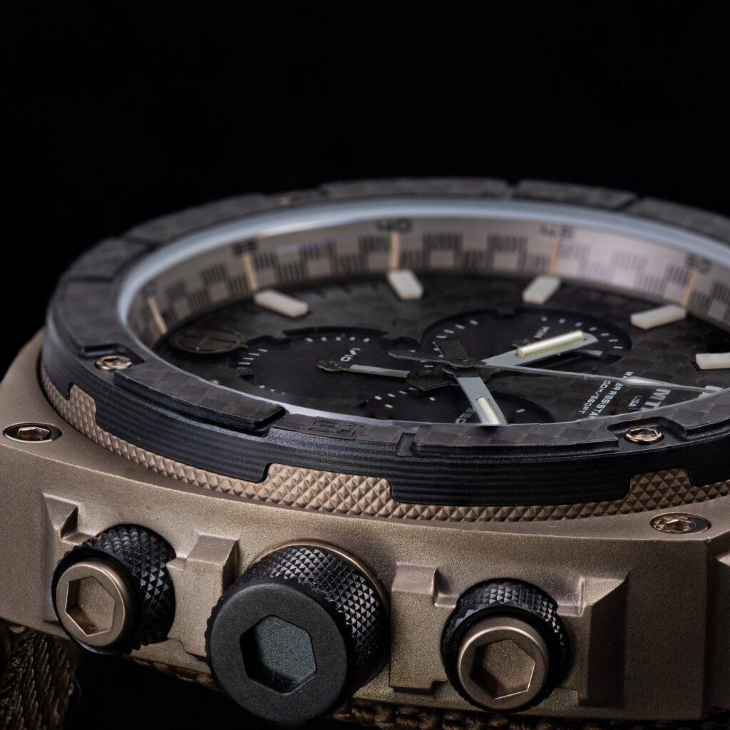- CASE: Solid Titanium with Carbon Fiber Rotating Bezel