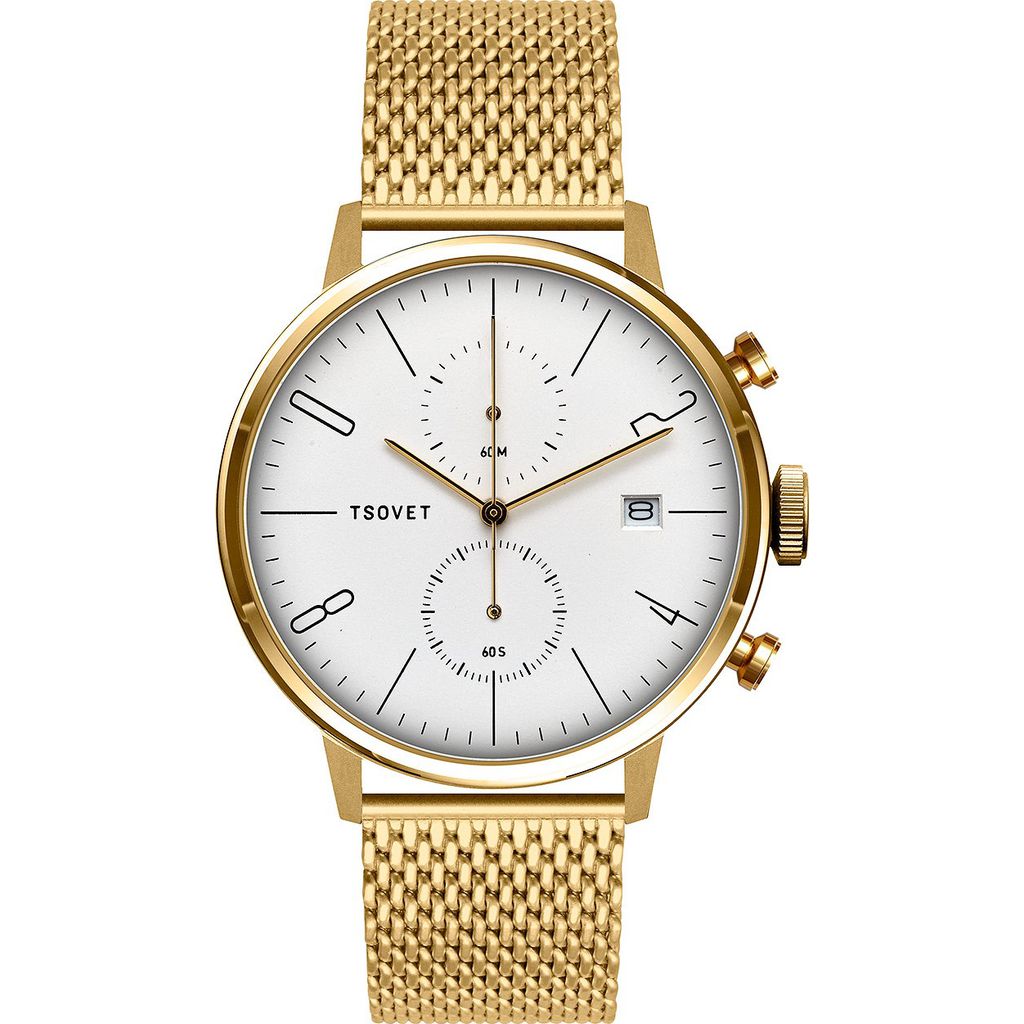 The Tsovet Gold & White JPT-CC38 Chronograph Watch is housed within a 316L aerospace-grade stainless steel case and accented with precision start/stop pushers. The face features a balance of fine details, distinct matte indicator hands, date function, and bold numerical representations, all underneath a domed crystal. These features along with its refined aesthetic make the JPT-CC38 a superior combination of elegance and function. Each component is hand built under the strictest of standards.